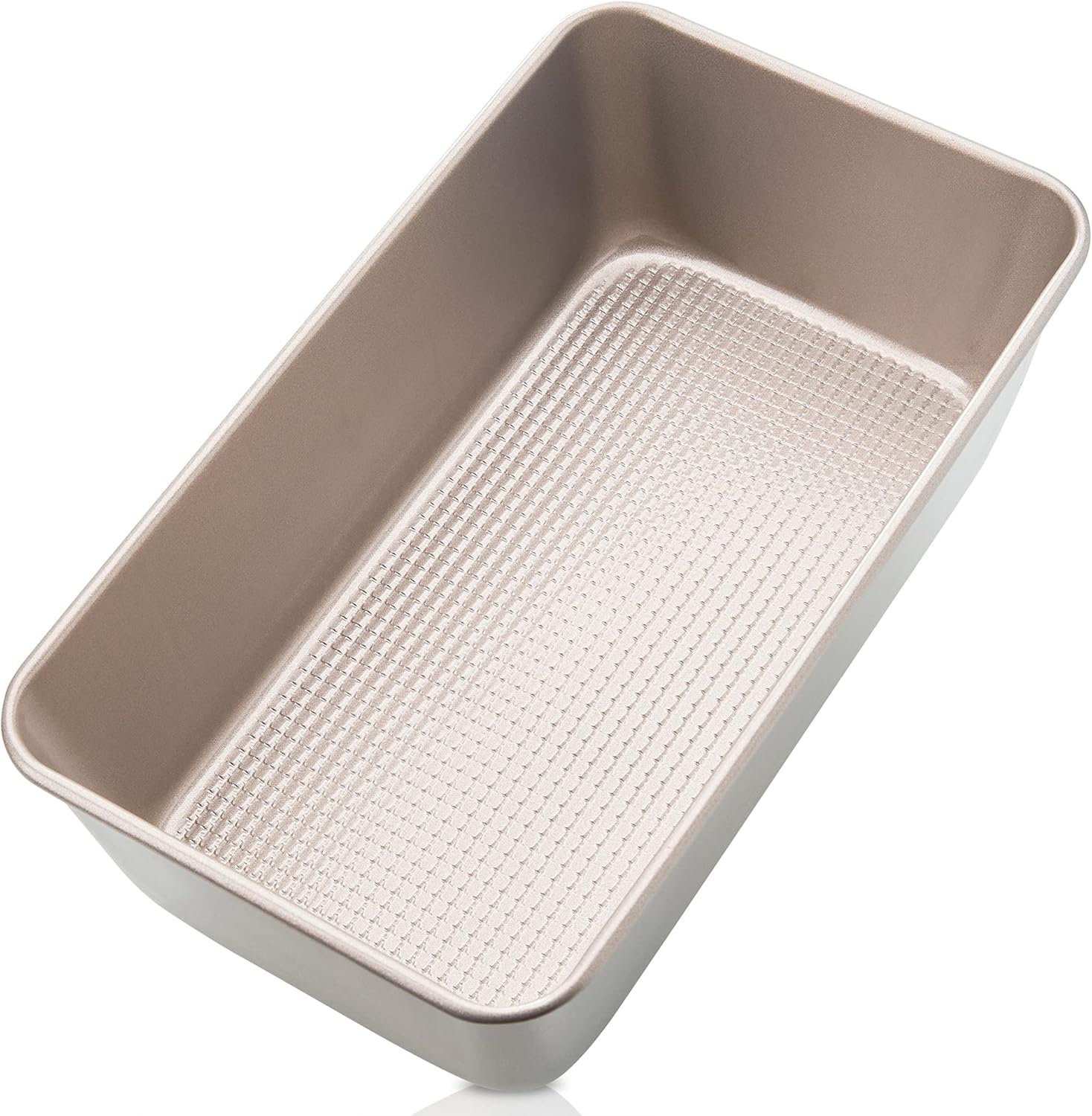 - QUICK, EASY RELEASE: Easily pop out bread, no spraying required! Our bread pan has a textured surface made of high-quality carbon steel that releases bread easily - just tip it over and it pops right out of the pan. Bake savory treats, no knead bread, banana nut loaf, and pound cake that releases easily - no food left behind!