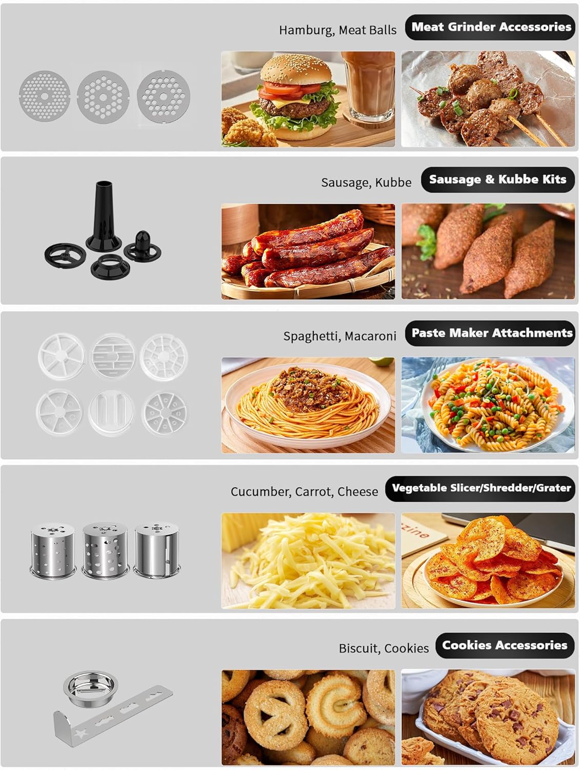 - 9-in-1 KITCHEN MACHINE - Vospeed kitchen stand mixer is a multi-functional food processor. It is equipped with a dough hook, whisk, beater, juice blender, meat grinder! Itβs a perfect kitchen helper for making cakes, bread, cookies, smoothies, juicer,salad, sausage, meat sauce etc. The splash guard helps to add ingredients without making a mess