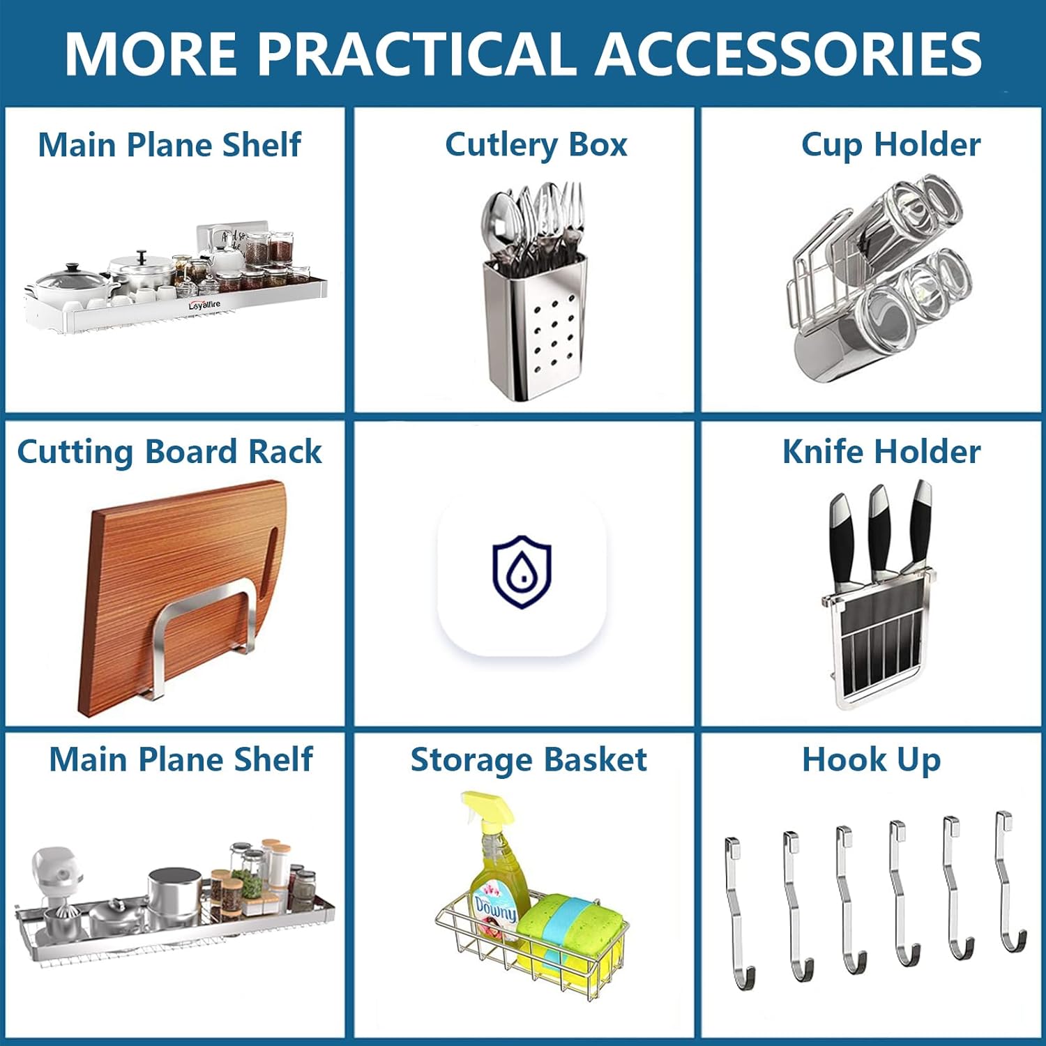 - ORGANIZE YOUR KITCHEN & EFFICIENT DRAINAGE: can meet the needs of any kitchenware. While the over the sink design enables it to drain water directly into the sink, effectively avoiding water pooling. Besides, the non-slip mat on the bottom effectively ensure the stability of the dish rack. All the accessories you need are complete, including knife holder, storage basket, cutlery holder, cutting board rack, cup hanging, hook up. (All accessories are made of stainless steel)