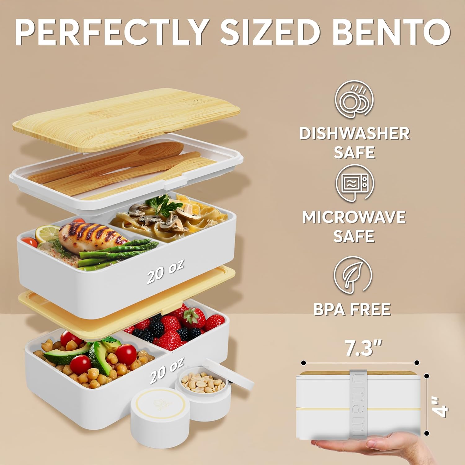 Umami Bento Box Adult All-In-1 w/4 Utensils, 2Sauce Jars, 2 Dividers, 100% Leakproof, Microwave & Dishwasher Safe, Stackable Bento Lunch Box Containers for Men/Women, White & Tan