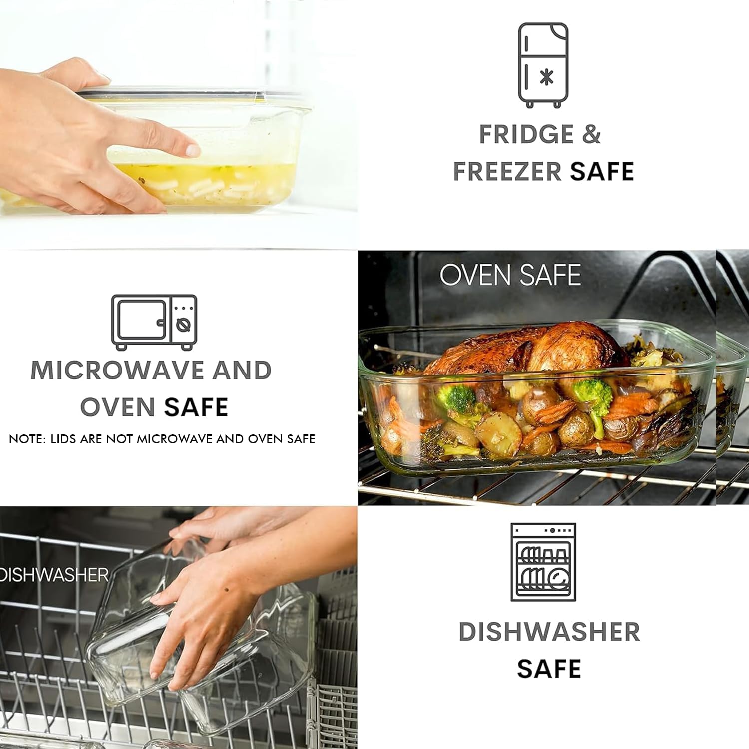 - Borosilicate Glass for Versatile use - Reusable refrigerator, Freezer, microwave and dishwasher safe (top shelf of dishwasher recommended), Heat Resistant Up To 900°F and Thermal Shock Resistant Up To 248°F. Plastic lids are not oven and microwave safe.