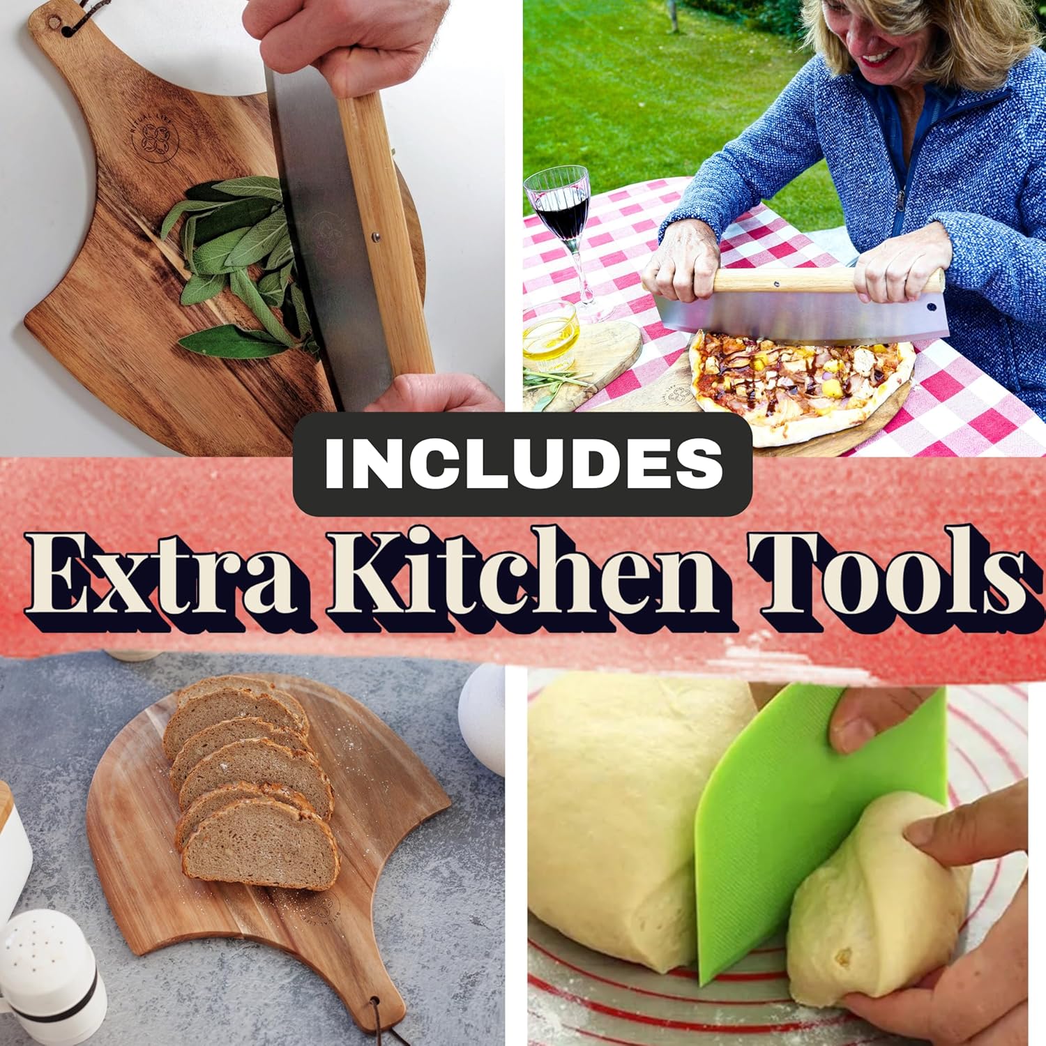 - COMPLETE 5-PIECE PIZZA MAKING SET: Includes everything you need - durable pizza stone with removable stainless steel handles, acacia wood pizza peel, stainless steel pizza cutter with comfort wooden handle and blade cover, recipe ebook, and dough tool scraper. Essential tools for both beginners and experienced pizza makers.