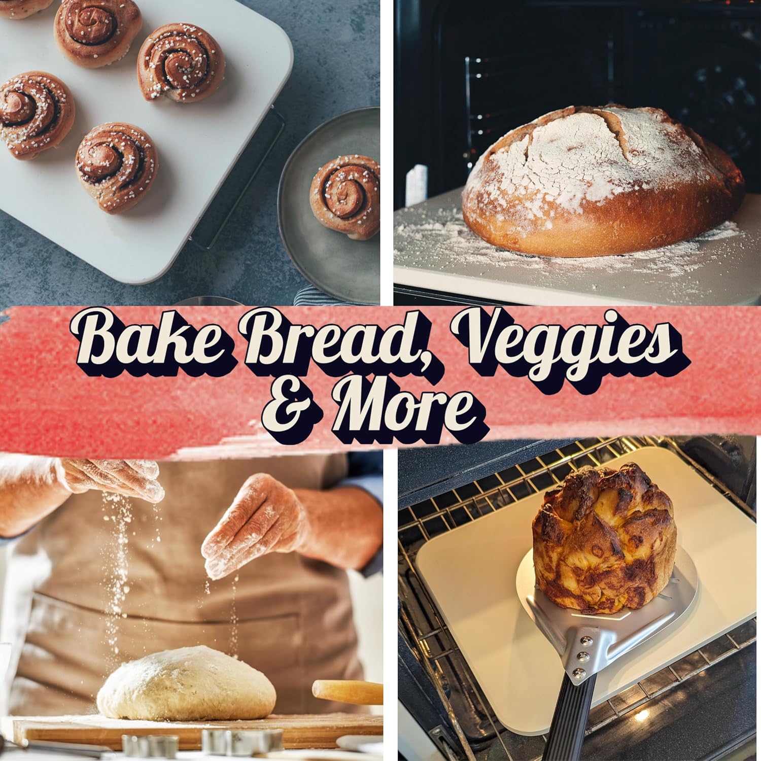 - EASY TO USE & VERSATILE: Beyond just pizza, our oven stone offers endless possibilities. Use it as nonstick bread stone for oven, baking stone for sourdough bread, biscuits, cookies, pastries, and more. The wood peel doubles as a cutting board or serving tray, while the slicer effortlessly cuts your food cleanly and precisely.