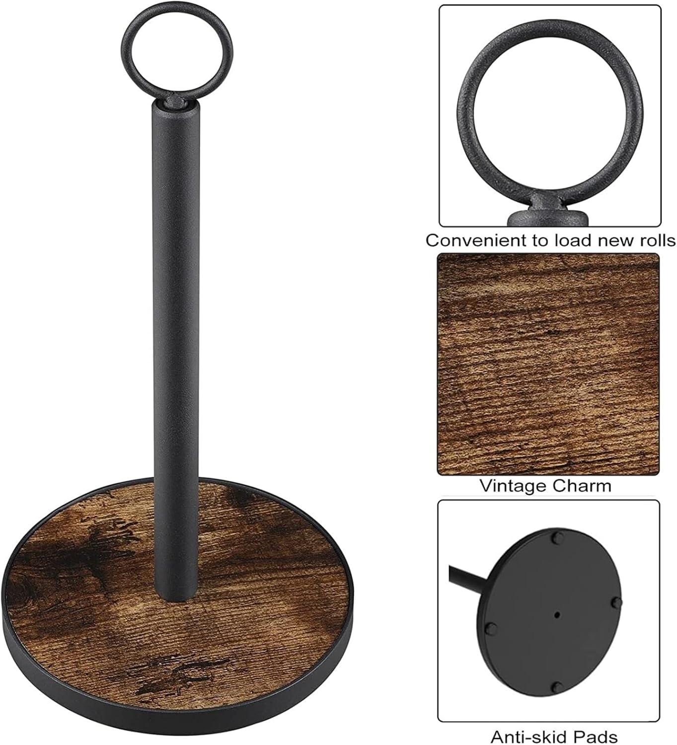 - Vintage Touch - This countertop paper towel holder features esthetic vintage wood base which will add a touch of farmhouse charm to your kitchen.