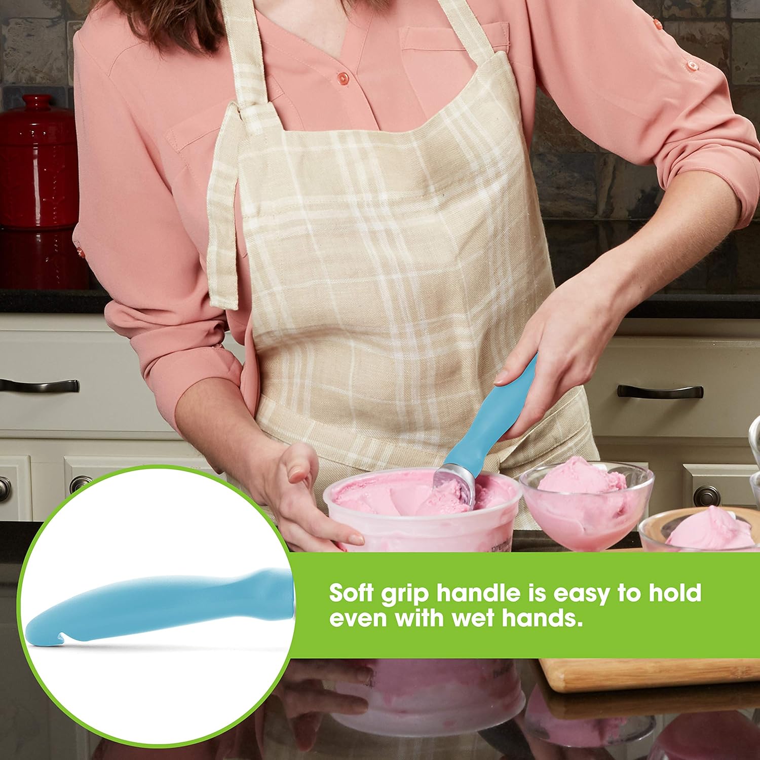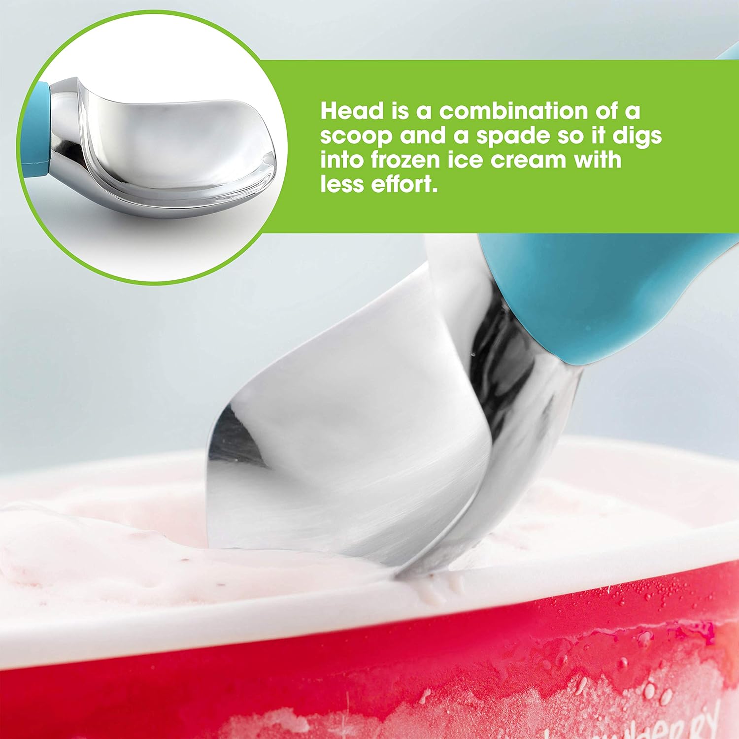 - Why Struggle With A Bad Scoop - With its pleasant weight, ability to get into hard-to-reach parts of a carton and excellent handling of hard ice cream, Spring Chefβs scoop does the heavy lifting. The soft grip handle is comfortable to hold, easy to grip, absorbs pressure and doesn't freeze your hand like scoops with a metal handle can. No antifreeze gimmicks. Simple yet ergonomic design that is easy to clean and will make scooping even easier.