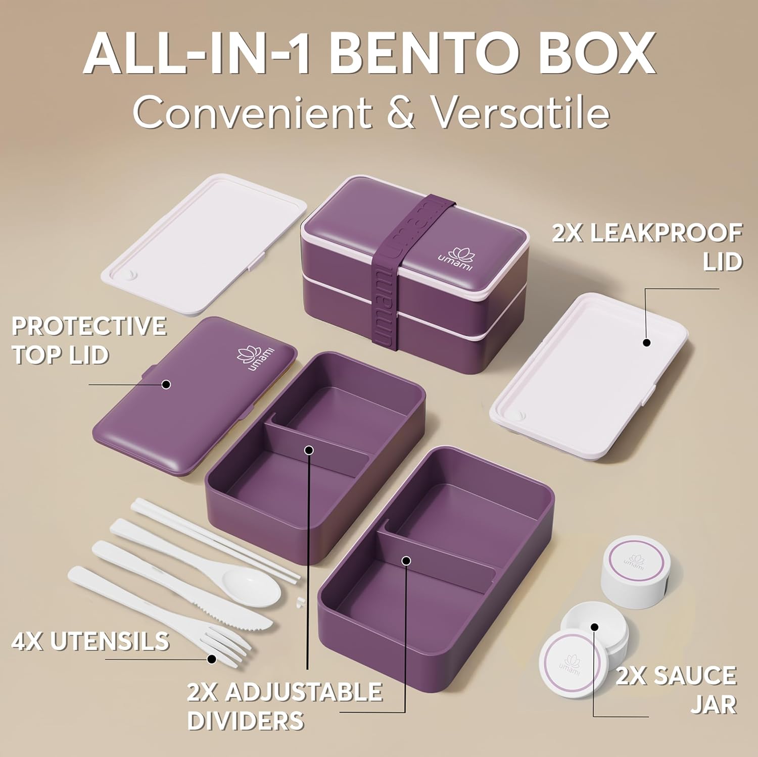 Umami Bento Box Adult All-In-1 w/4 Utensils, 2 Sauce Jars, 2 Dividers, 100% Leakproof, Microwave & Dishwasher Safe, Stackable Bento Lunch Box Containers for Men/Women, Royal Purple, 40 oz
