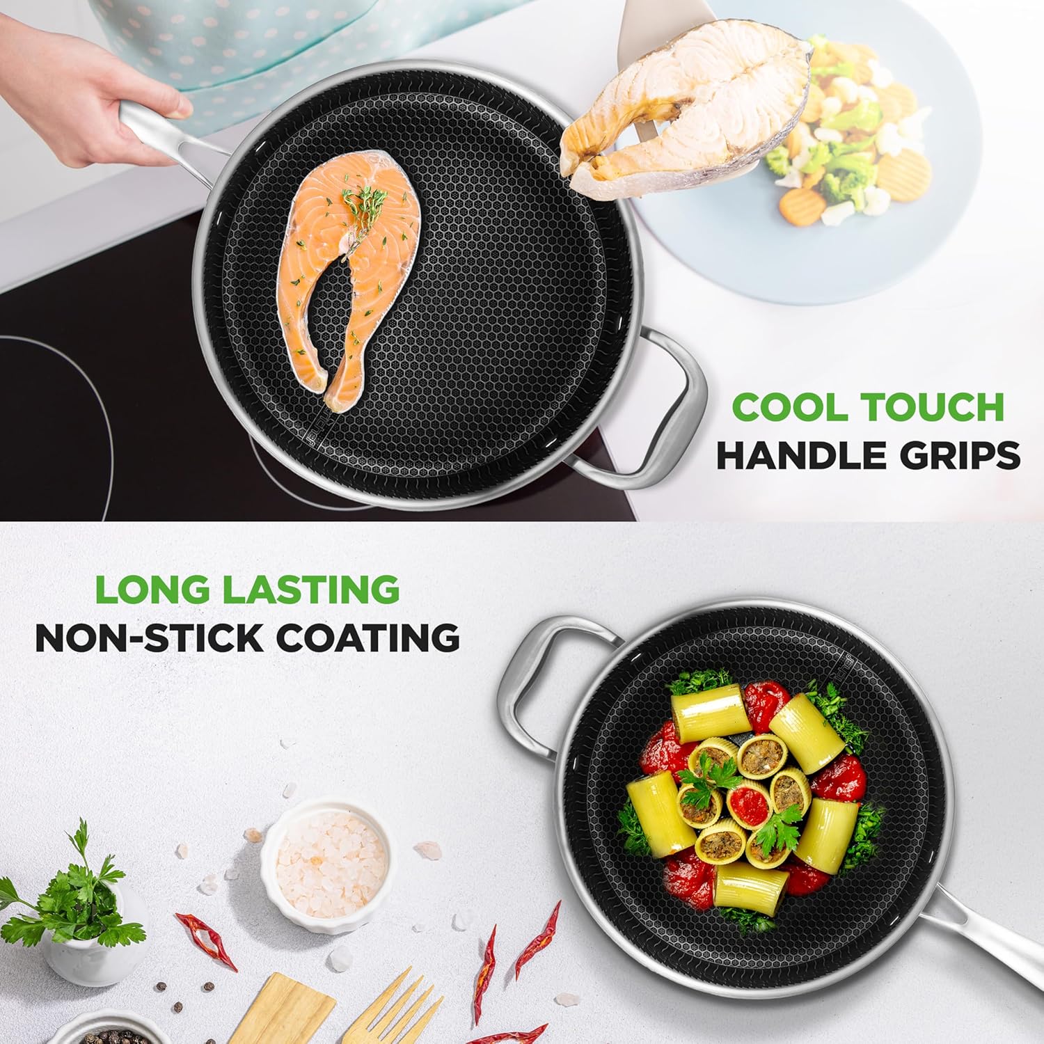 - SCRATCH-RESISTANT: The stainless steel cooking pan pot features raised-up honeycomb fire textured pattern that forms an outstanding scratch-resistant surface so it is safe to use metal utensils. Cooks like stainless steel w/ ease of non-stick cleanup