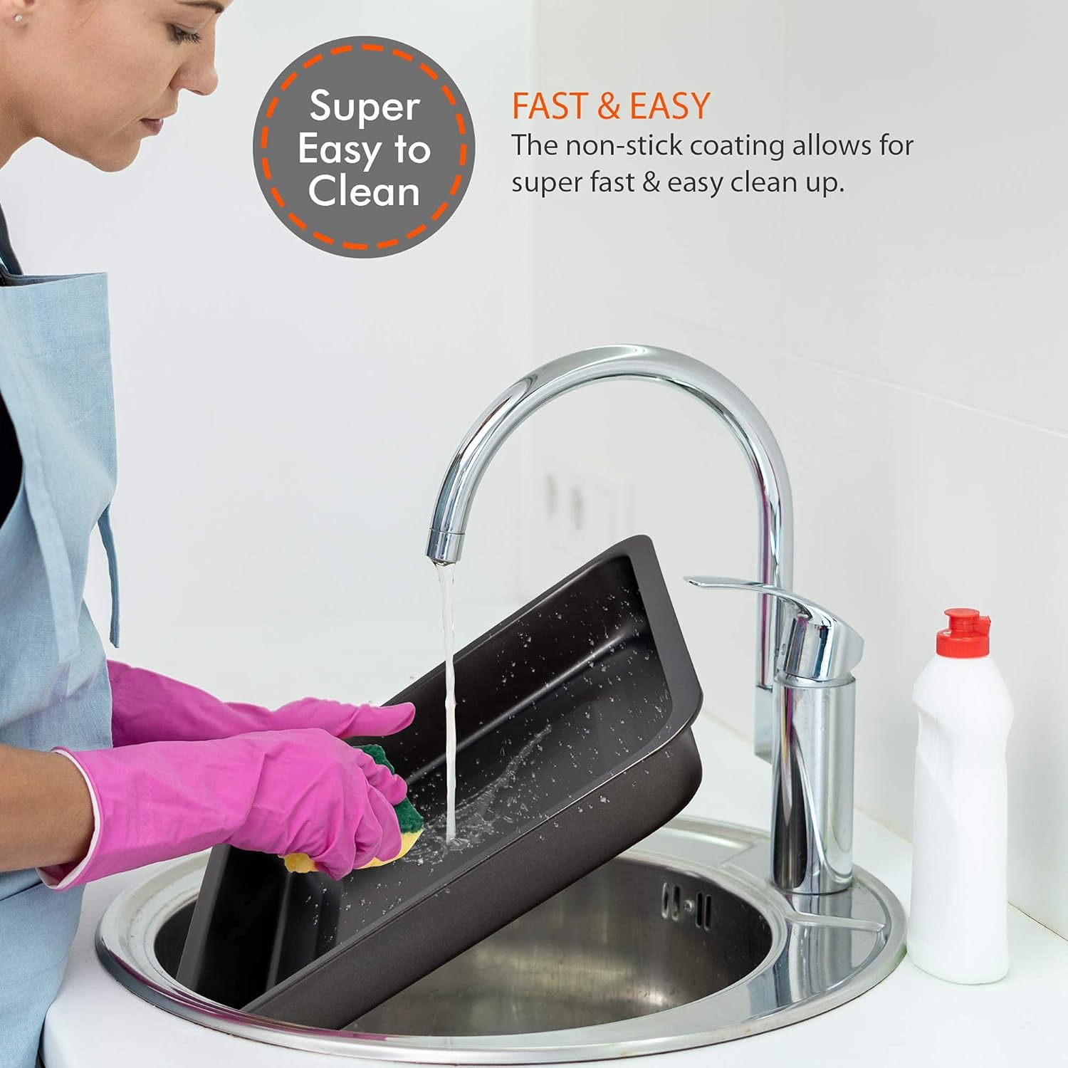 - OVEN SAFE, DISHWASHER SAFE: The pans are oven safe up to 446 degrees. The non-stick coating makes them really easy to clean in the sink but they are dish washer safe as well. Create the most delicious dishes like jelly roll, brownie, chocolate cookies, apple pie, cake and much more!