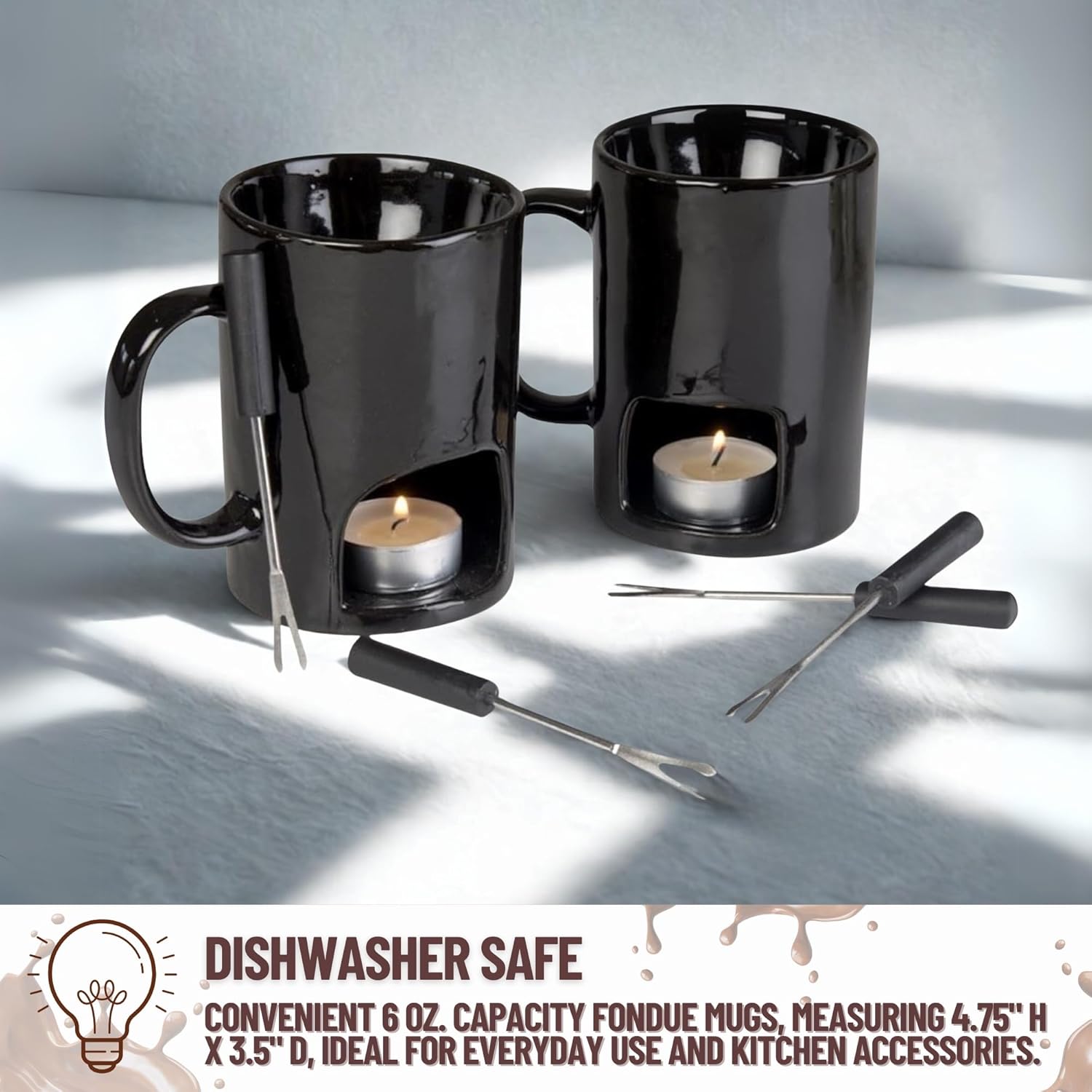 - Durable : Sleek ceramic personal fondue mugs feature a clean, minimalistic shape and are available in your choice of classic white or black to complement any table setting. Nothing to plug in, no large pot to clean. 8 tealight candles are included. They are easily replaced with any tealight for years of use