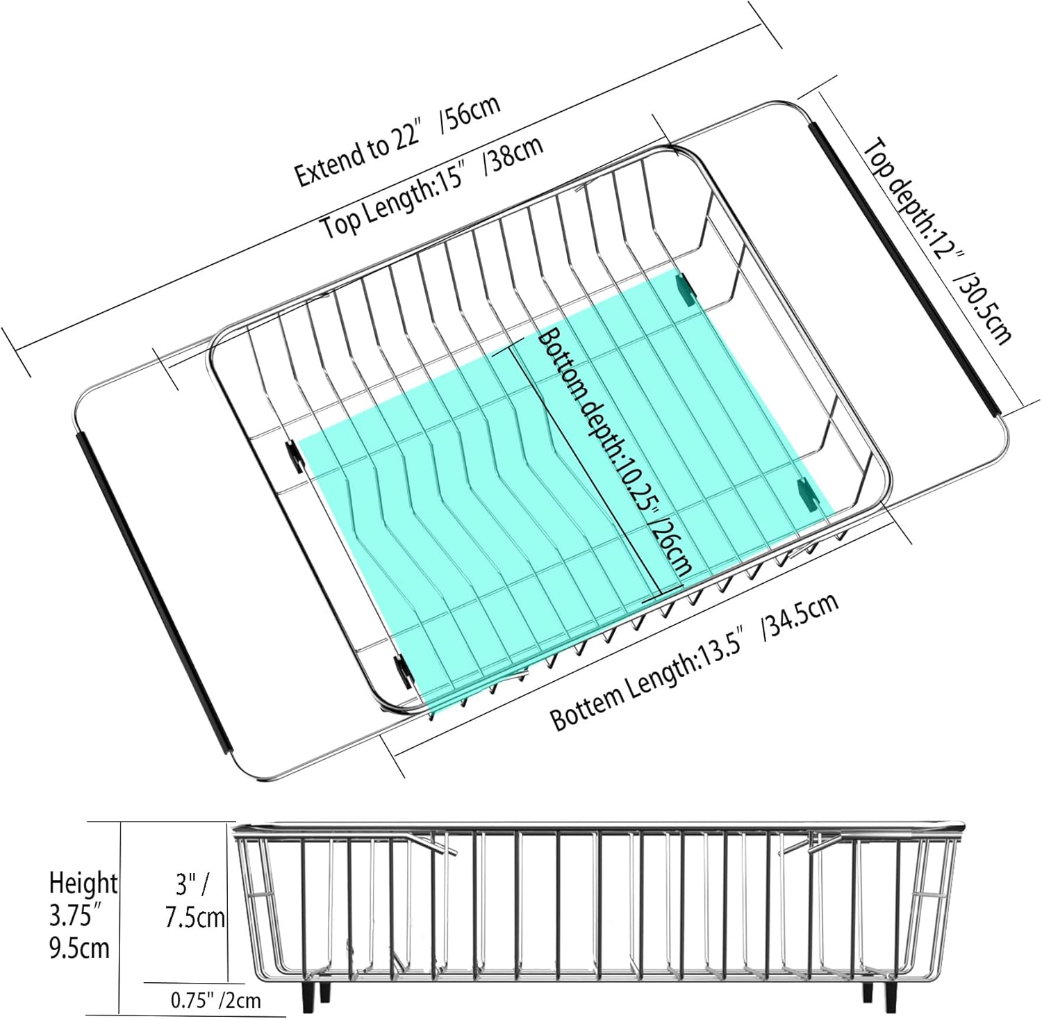 - SIZE DETAILS - Please check the picture 2. Drain basket Height:3.75". length and depth of top of basket:15in x 12in, Length and depth of bottom of basket:13.5in x 10.25in ; Drain basket arm extends 15 to 22 inches long and it can place over the sink measuring between 16 to 22 inches and more than 12.5 inches deep. With extendable arm, it can be used over the sink, on the countertop or in the sink to save space in compact kitchens.