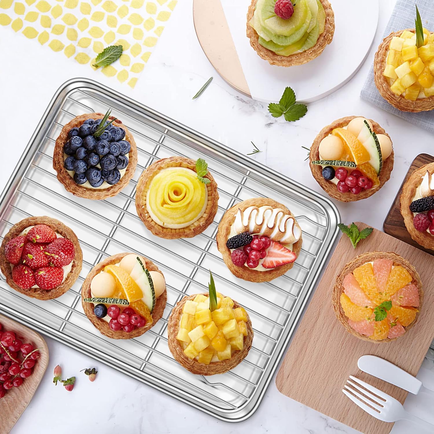 - š [SOLID CONSTRUCTION] Thick gauge with sturdy construction, these heavy-duty half sheet pans have a reinforced, rolled edge that provides extra strength to help resist warping in the oven. The cooling racks with raised feet facilitate air circulation for evenly baked goods. Feel sturdy and solid in hands, durable for serving many years.