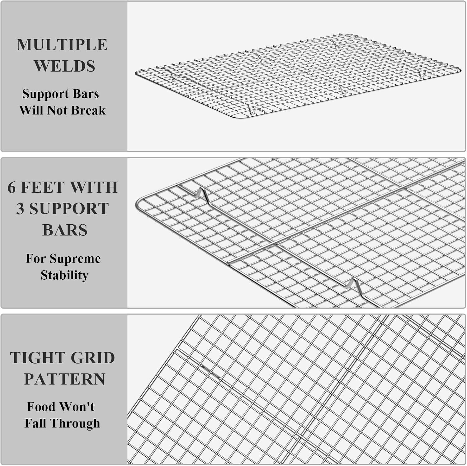 - š [SOLID CONSTRUCTION] Thick gauge with sturdy construction, these heavy-duty half sheet pans have a reinforced, rolled edge that provides extra strength to help resist warping in the oven. The cooling racks with raised feet facilitate air circulation for evenly baked goods. Feel sturdy and solid in hands, durable for serving many years.