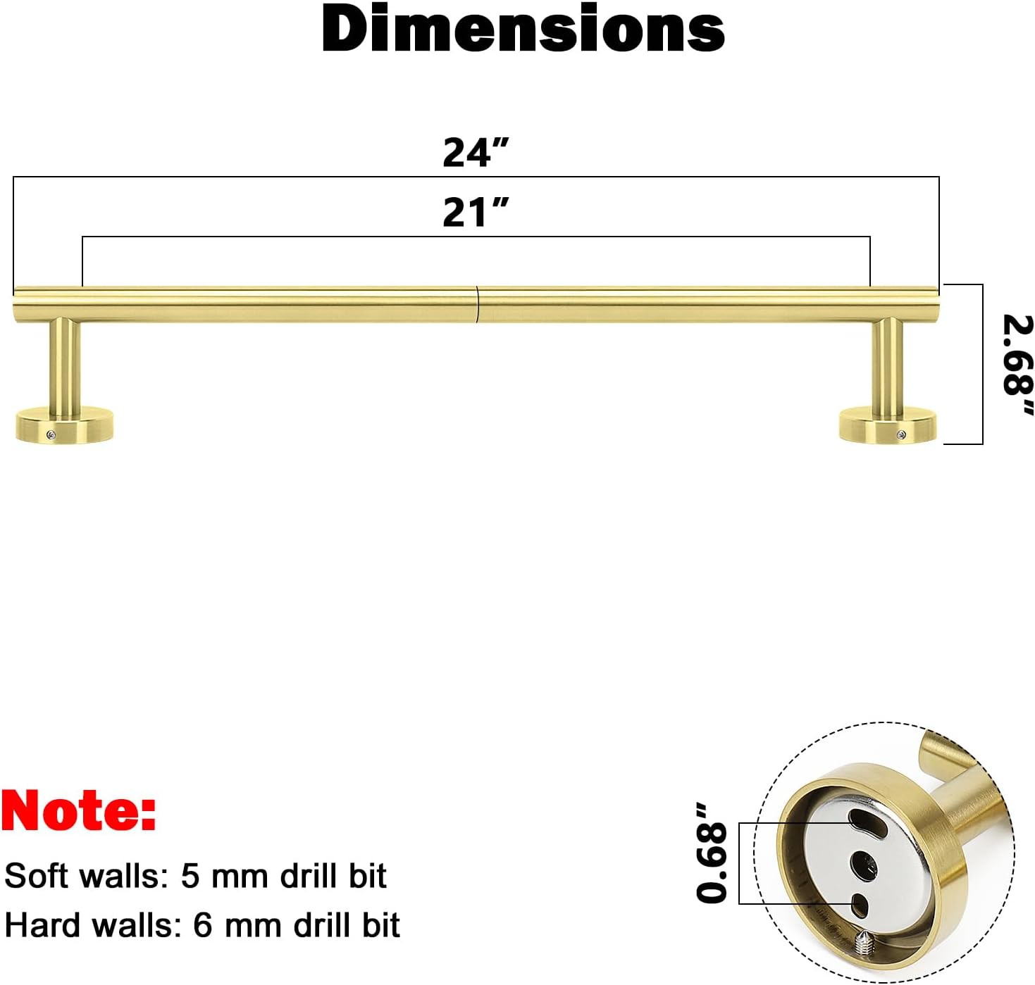 - DIMENSIONS & USE: Overall length is 24" (609mm); The length of hanging space is21" (535mm); 22-Lbs (10kgs) max weight capacity; You can mount this towel bar to either side of your cabinet or closet door for storing at-use hand and dish towels; It can also be used with S hooks, hanging bath balls, hair dryers, tea cups, spoons, clips, etc