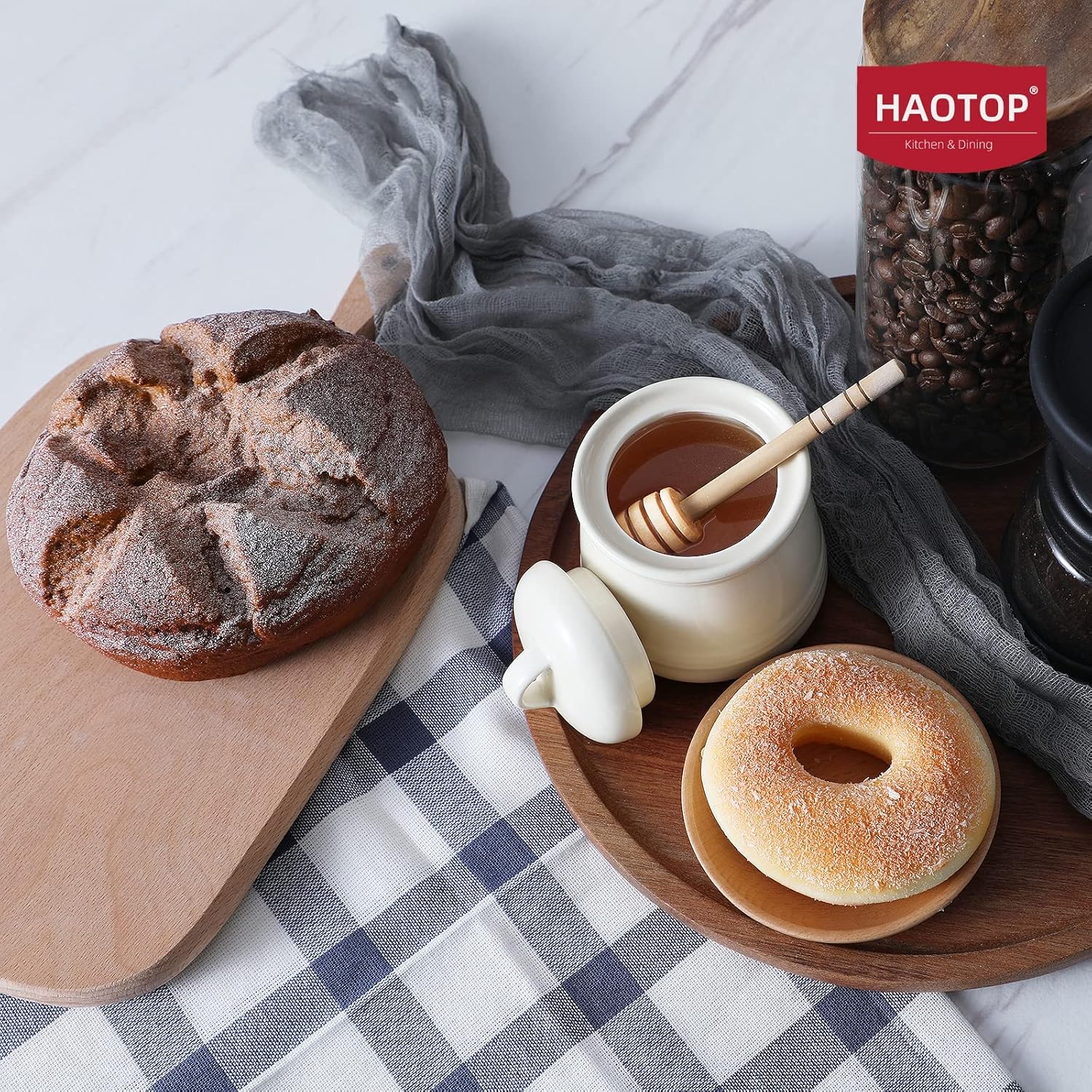 - PERFECT COMBINATION:HAOTOP Honey Jar Set is equipped with a perfect lid and a honey Dipper. The lid can keep your ingredients away from dust. There is a perfect notch on the lid for the honey Dipper. They are a perfect combination of suits. If you have your own coffee spoon, you can also use it for Sugar Bowl