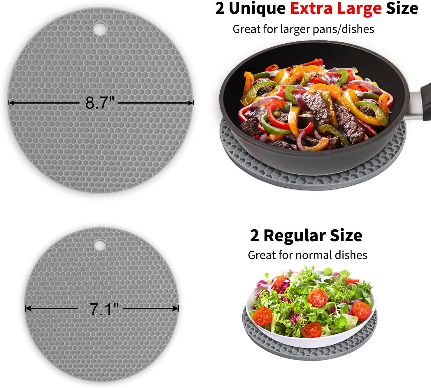 - MULTI FUNCTION: Walfos Hot Pot Holder is a multi-purpose kitchen tools. Package includes 4 kitchen trivets with 2 sizes, 2 are regular size with 7.1 inch diameter, 2 are extra large size with 8.7 inch diameter, suitable for holding larger size hot pots, pans and dishes. Also can be used as silicone mats, drying mat, bowl mat, jar opener, spoon holder, garlic peeler and coaster