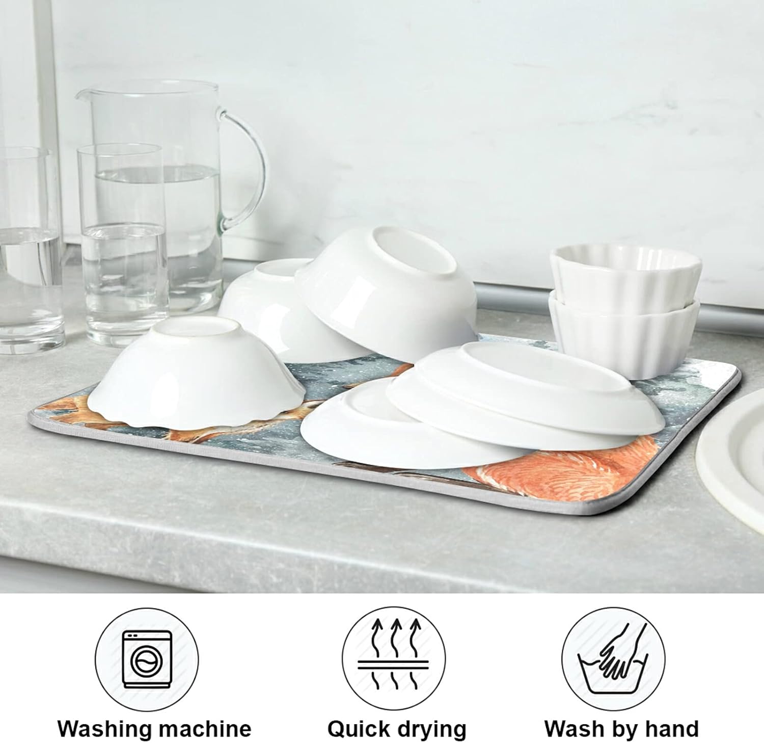 Super Absorbent Dish Drying Mat, Microfiber Fast-Drying Dish Mat, 16" x 18", Kitchen Dish Drying Pad, Watercolor Cute Fox Winter Christmas