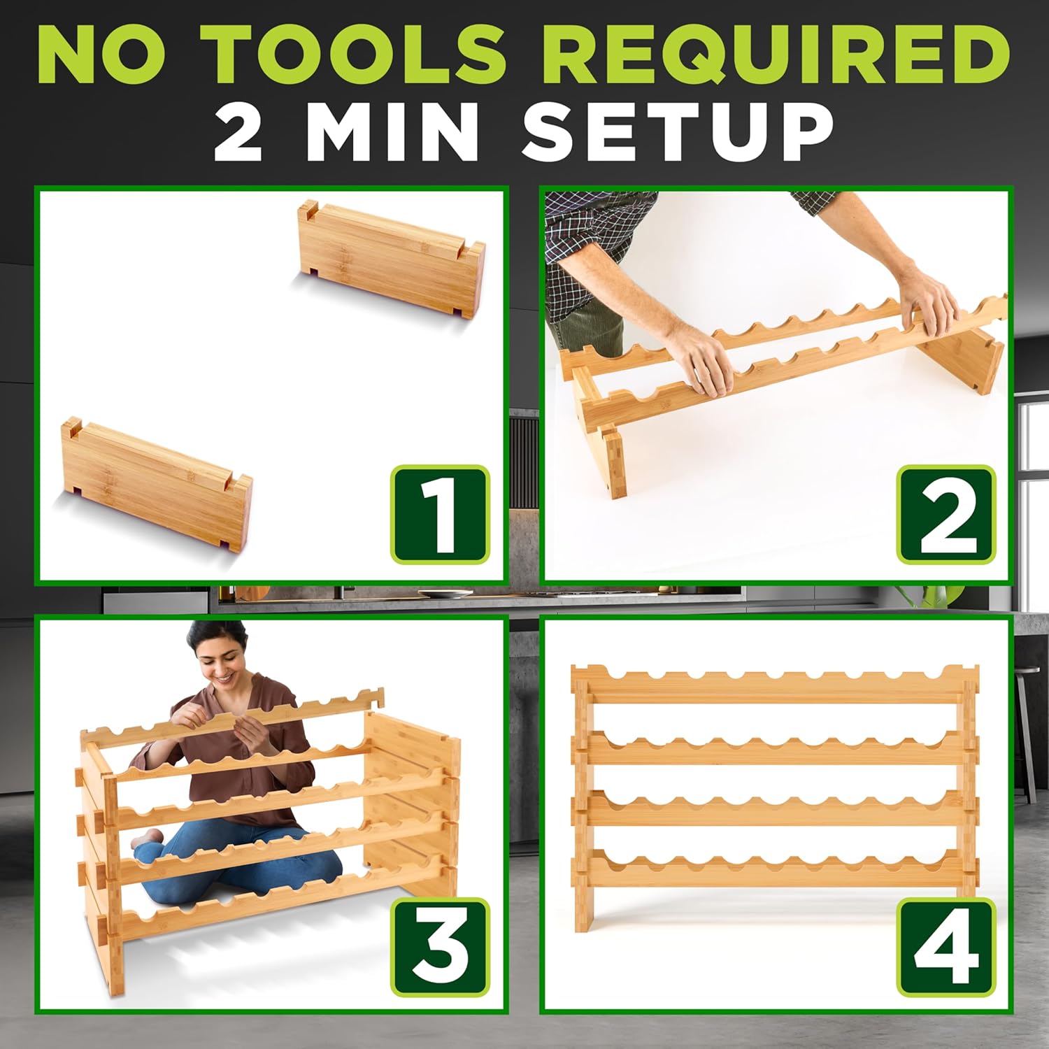 - NO TOOLS 2 MIN SETUP: The modular wine stacker is very easy to assemble. The freestanding 4-tier modular wine display shelf comes in 8 wave bars & 8 blocks that easily snap together w/ no need for any hardware or tools! Assemble in just 10 minutes or less