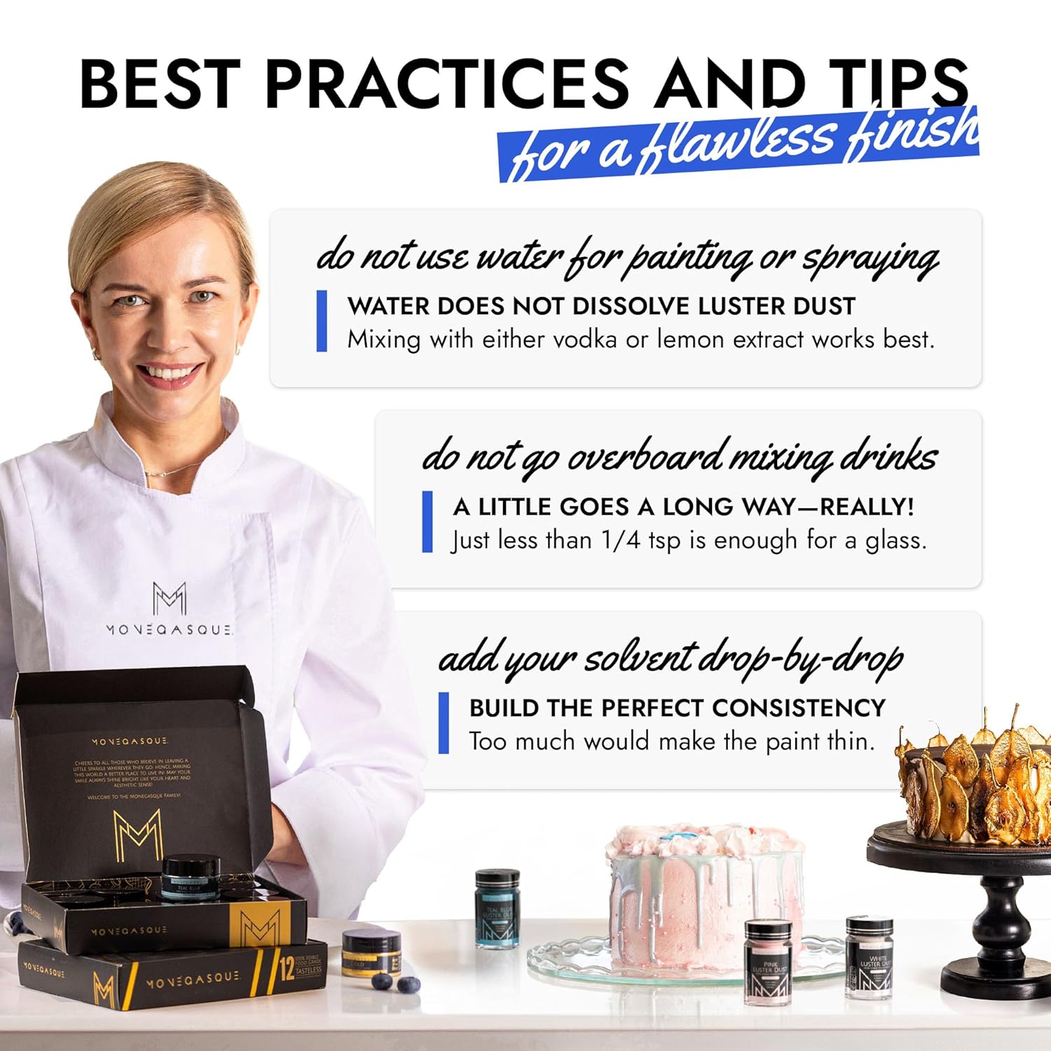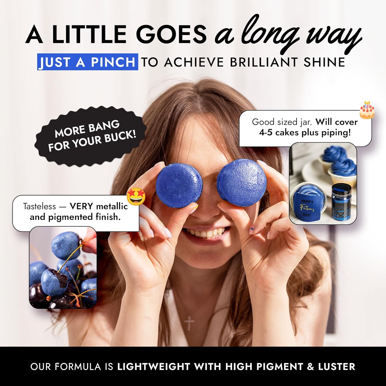 - EASY TO USE: Our blue luster dust is incredibly versatile. Apply with a wet brush, airbrush, or dry brush, and even mix into beverages. Achieve professional-looking results effortlessly at home, whether decorating halloween cakes or adding shimmer to cocktails.
