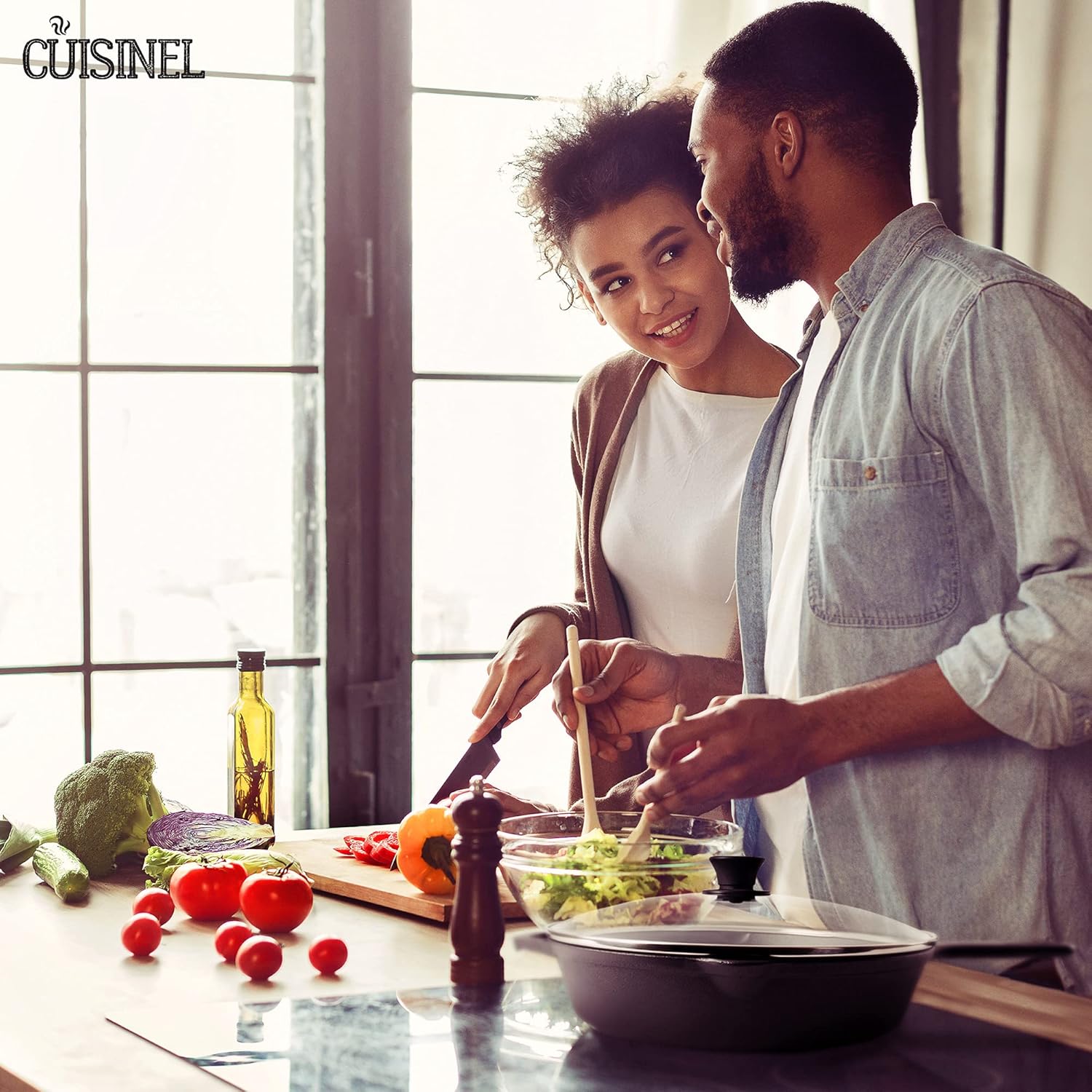 - COMFORTABLE, OVEN-SAFE SILICONE KNOB: Easy-grip silicone and Bakelit handle resists heat for quick cooling and comfortable non-slip grip. Flat top of knob allows you to stand the lid upside down, effectively eliminating dripping moisture off the lid. Rust-proof screw keeps lid secured to the knob. Keep heat, moisture, flavor and nutrients in your pan or pot at all times. Lid circulates heat and steam to more evenly cook delicious meals.