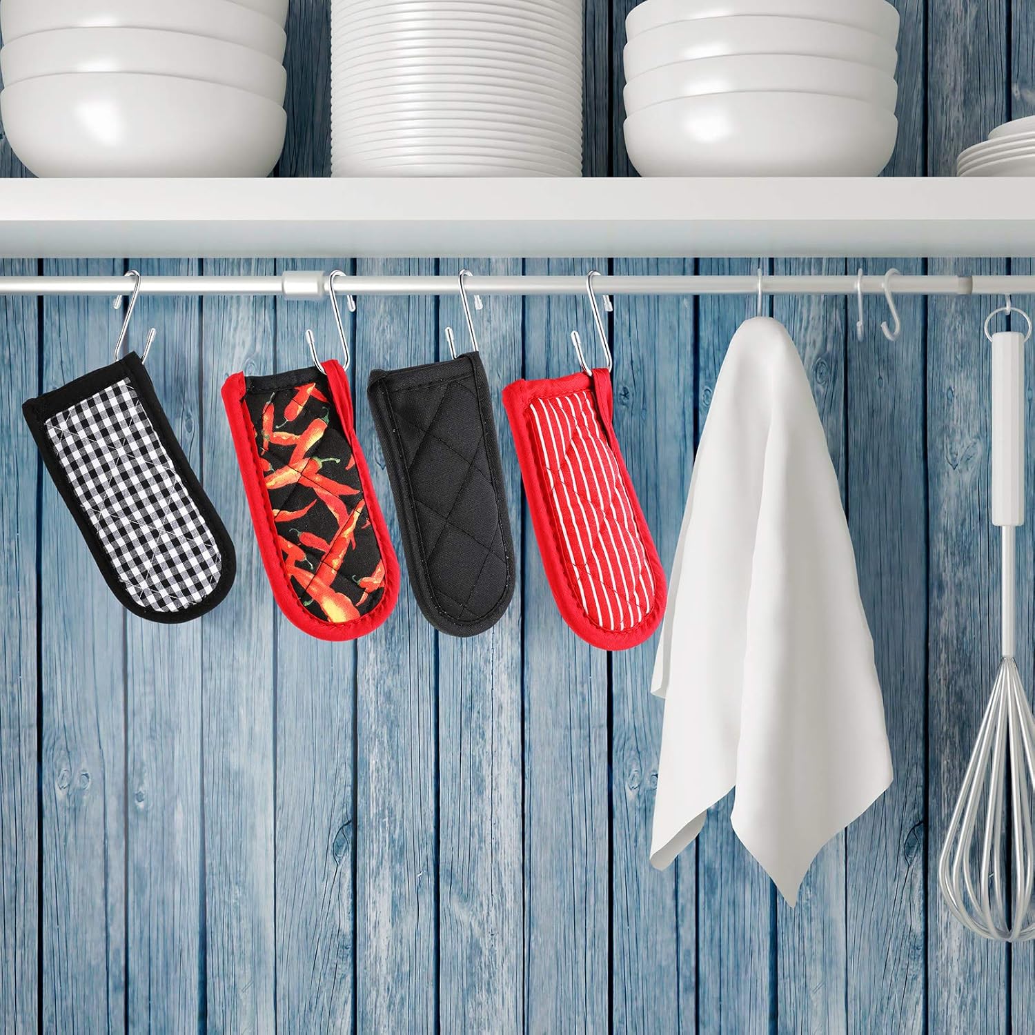 - Sufficient styles set: 4 styles of these non-slip pot sleeve grips for you to choose, include solid black color, black and white buffalo plaid, red base color with white stripe, black base with red pepper design, you can choose the styles you want to add touch to the kitchen cookware