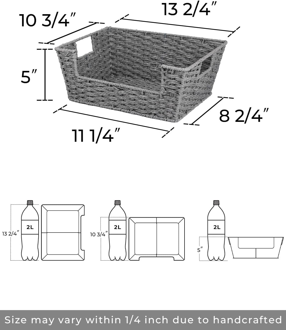 - Dimensions: 13 ¾"L x 11"W x 5 ½"H, size may vary within 1/4 inch due to handwoven design.