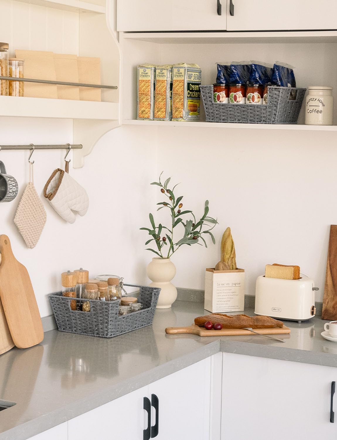 StorageWorks Round Paper Rope Woven Basket for Pantry Organizers and Storage, Stackable Wicker Pantry Baskets for Shelves, Grey, 2-Pack