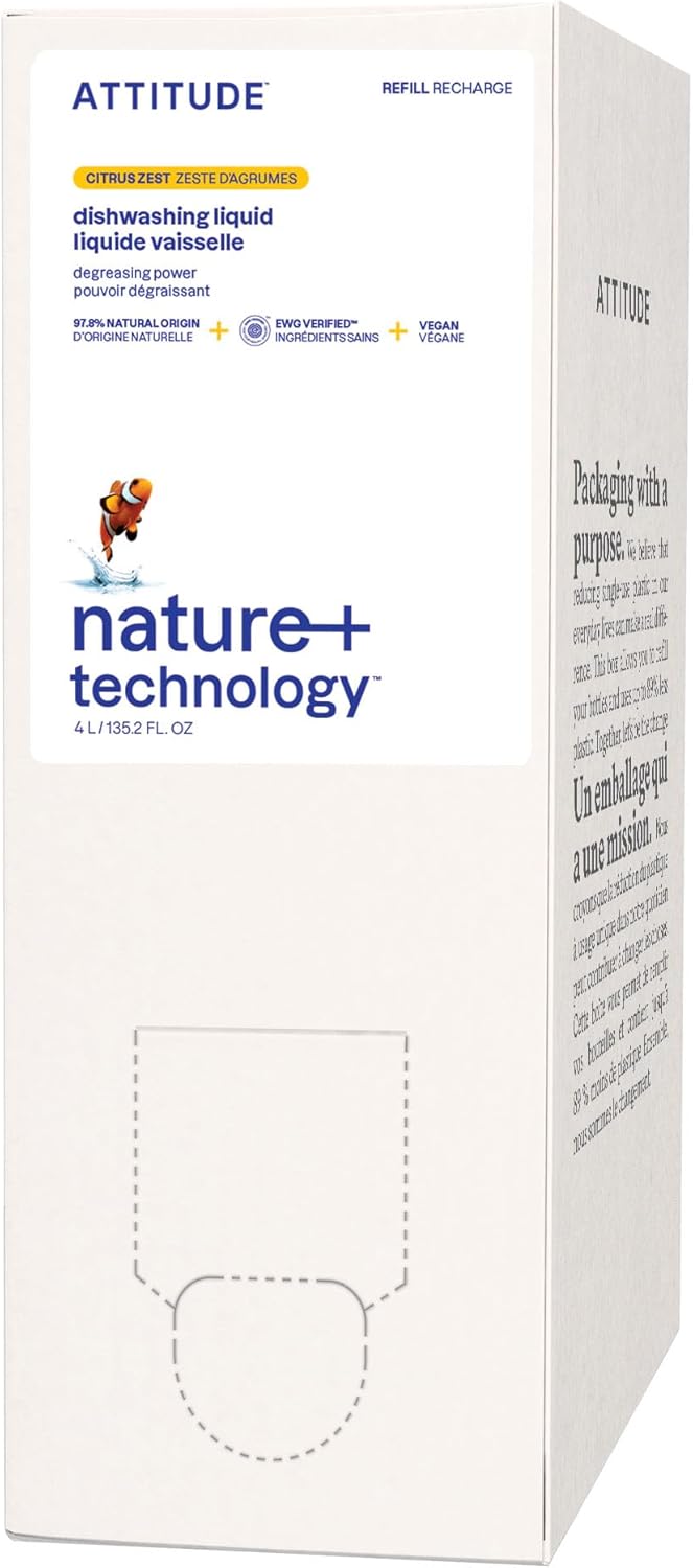ATTITUDE Dish Soap Refill, EWG Verified, Plant-Based & Vegan Dishwashing Liquid, Naturally Derived, Citrus Zest Scent, 135.3 Fl Oz