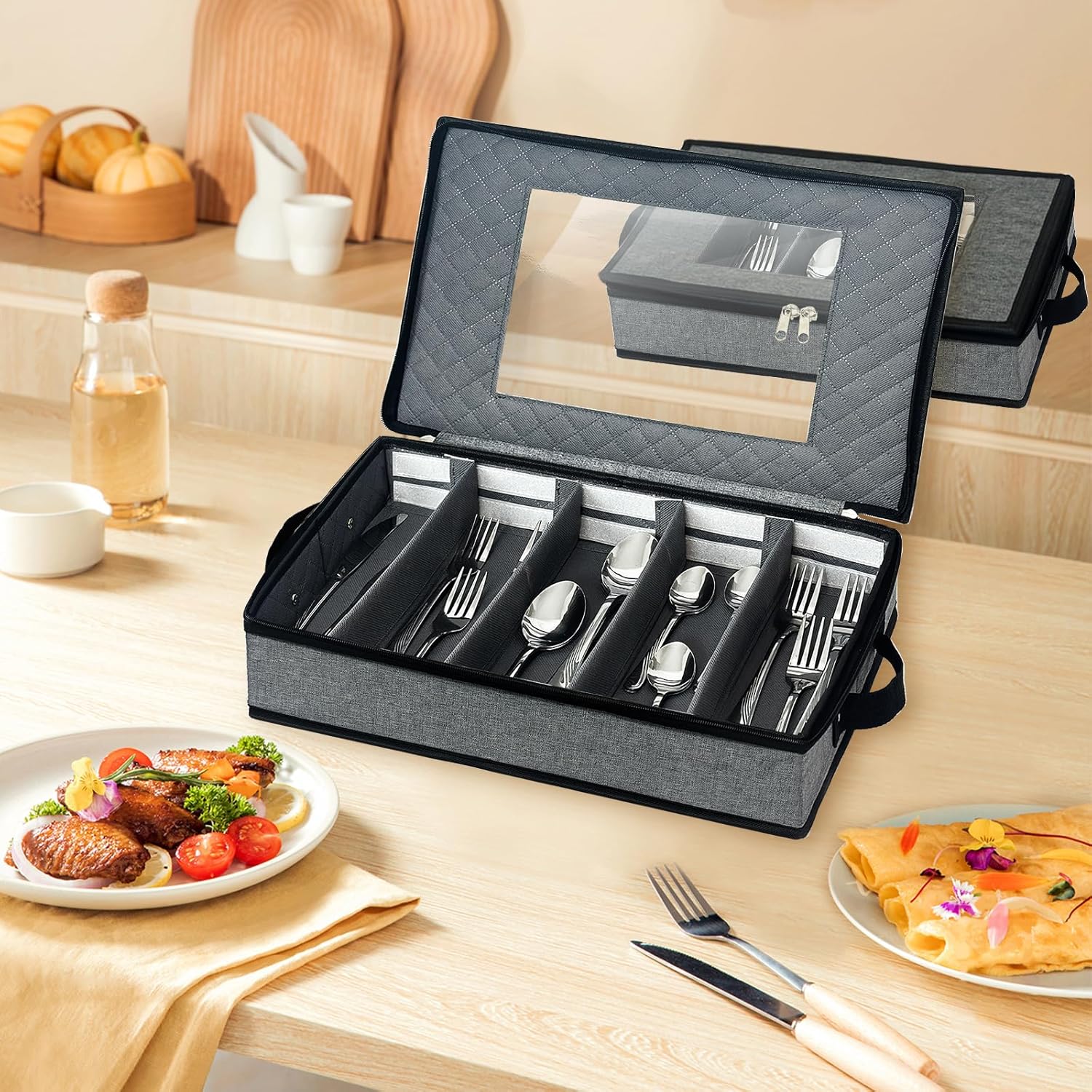 - 🔪【Large capacity flatware storage】: Our silverware storage box is 16.7" W X 11.6" D X 3.15" H. It features 5 customizable compartments and 4 removable padded dividers for storage and protection. The utensil storage can hold up to 12 pieces in each compartment.