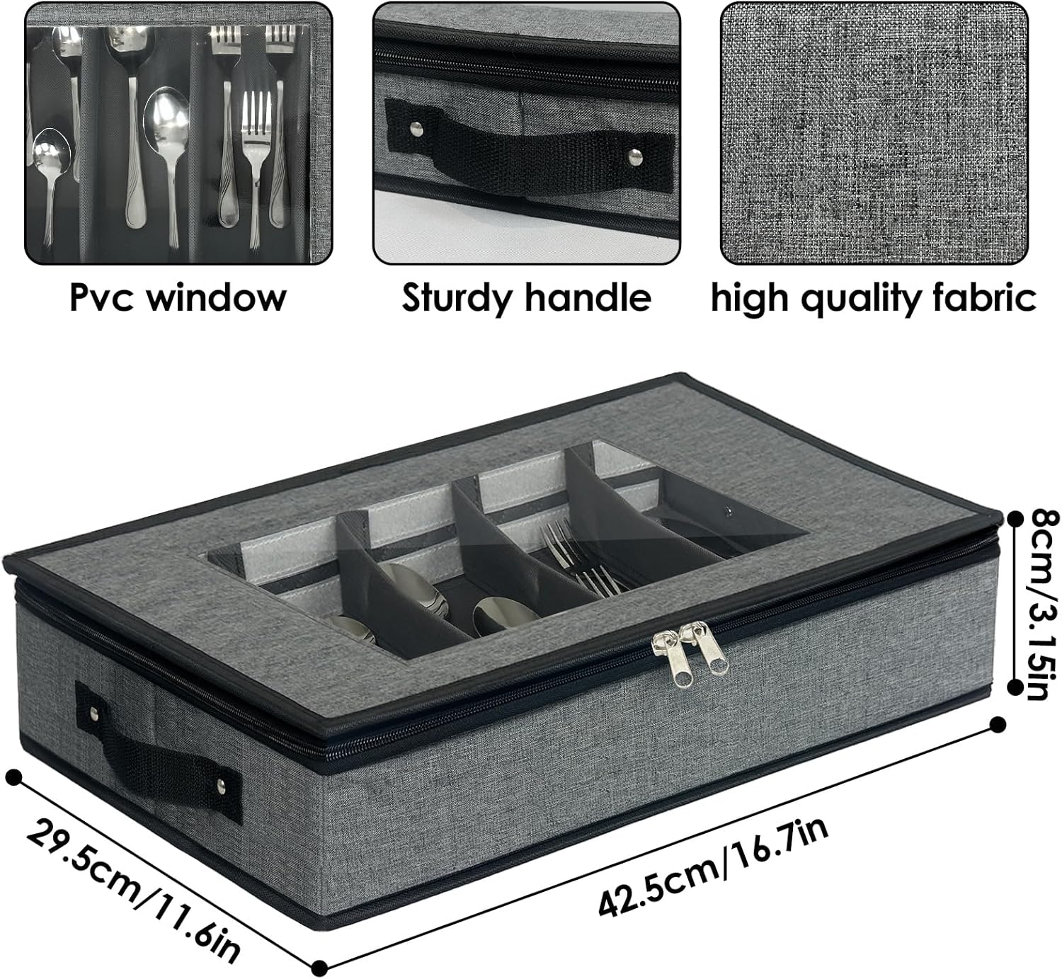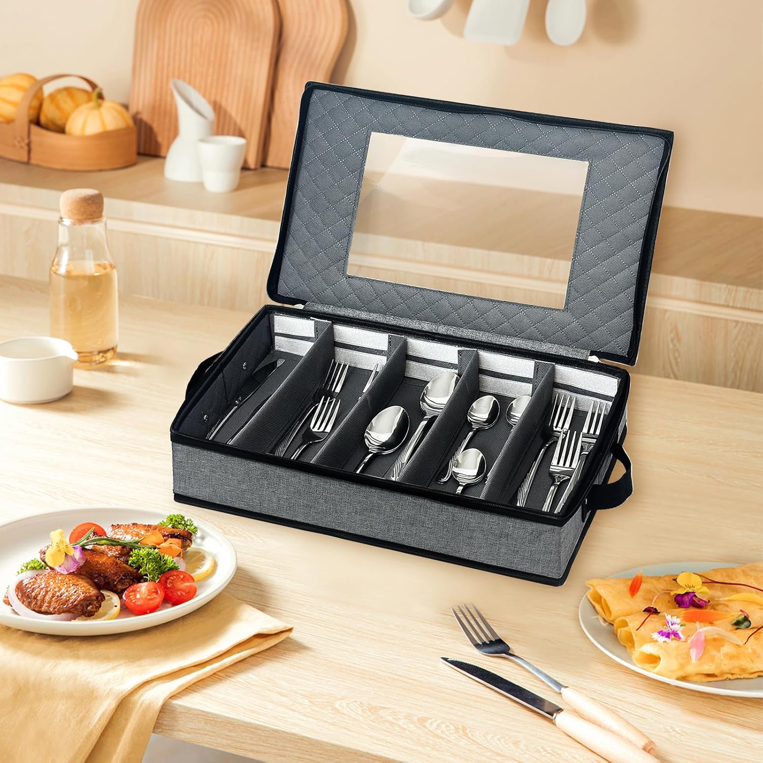 - 🔪【Large capacity flatware storage】: Our silverware storage box is 16.5" W X 11.4" D X 3.15" H. It features 5 customizable compartments and 4 removable padded dividers for storage and protection. The utensil storage can hold up to 12 pieces in each compartment.