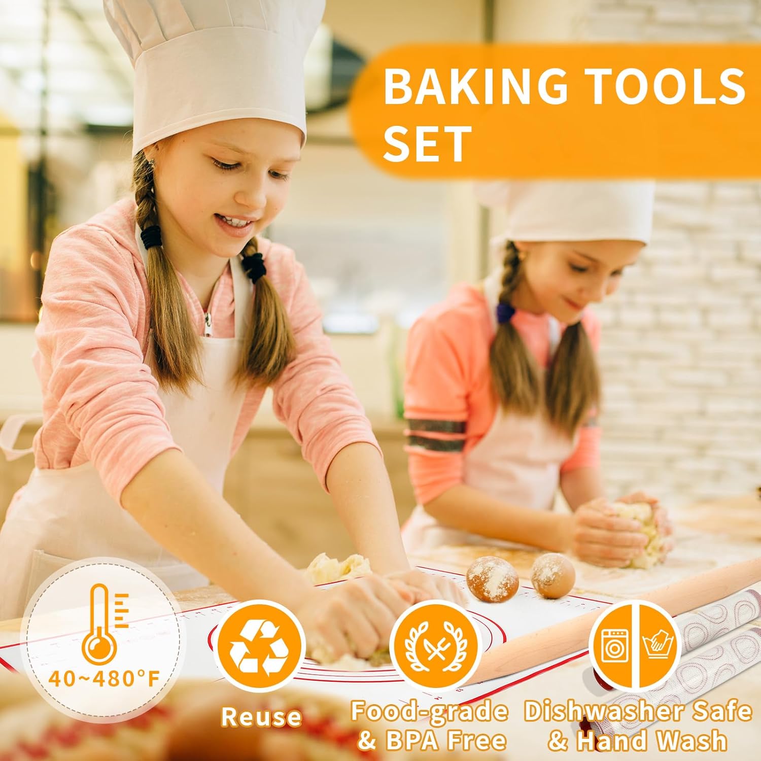Silicone Baking Mat Sets, Dough Mat with Macaron Baking Mat Pastry Cutter Rolling Pin,Food Safe Pastry Mat, Reusable Cookie Sheets Liner