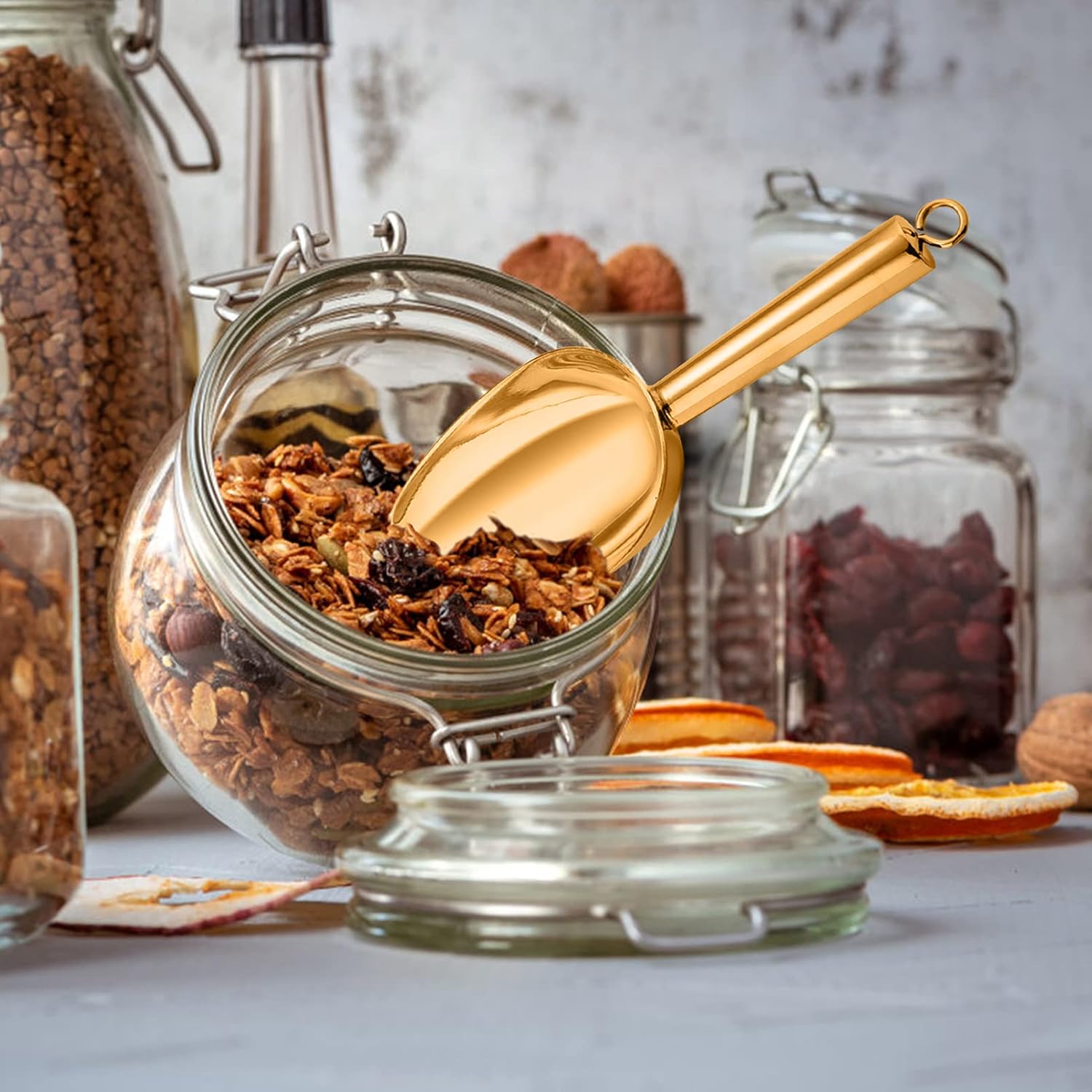 - Multi-Purpose: 5oz metal ice scoop, Overall length 8 inch, Bowl 4.5’’ L x 2.7’’ W x 1.5’’ H, Compact size to scoop from small bins or containers, 2 pcs meet different uses to scoop ice cubes, coffee beans, grains and flour at the same time