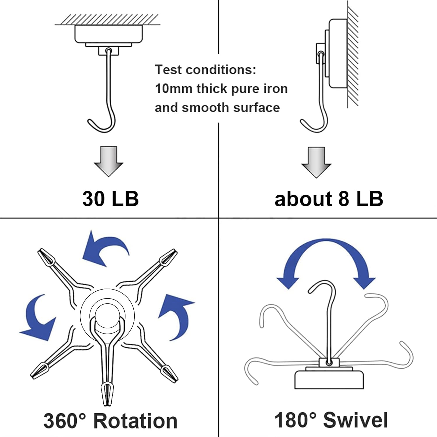 - 【Industrial Grade】30LBS Capacity is based on vertical application -- reduced by 2/3 if used horizontally. The magnetic hook is 60mm (2.36in) in length and 16mm (0.63in) in diameter.