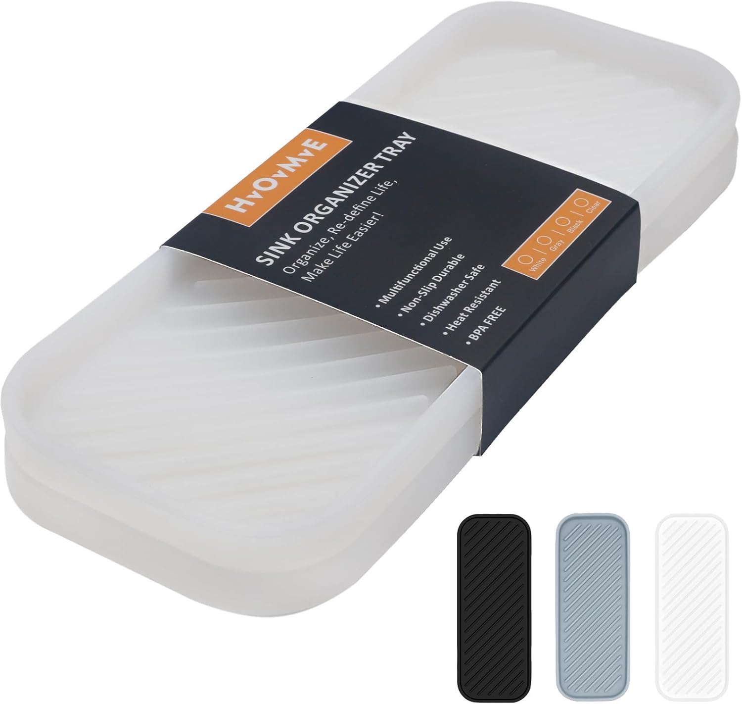 Silicone Organizer Tray, Soap and Sponge Holder for Kitchen Sink, Bathroom - Storage Tray for Dish Brush, Soap Dispenser, Dishwashing Accessories- 2 Pack (Clear)