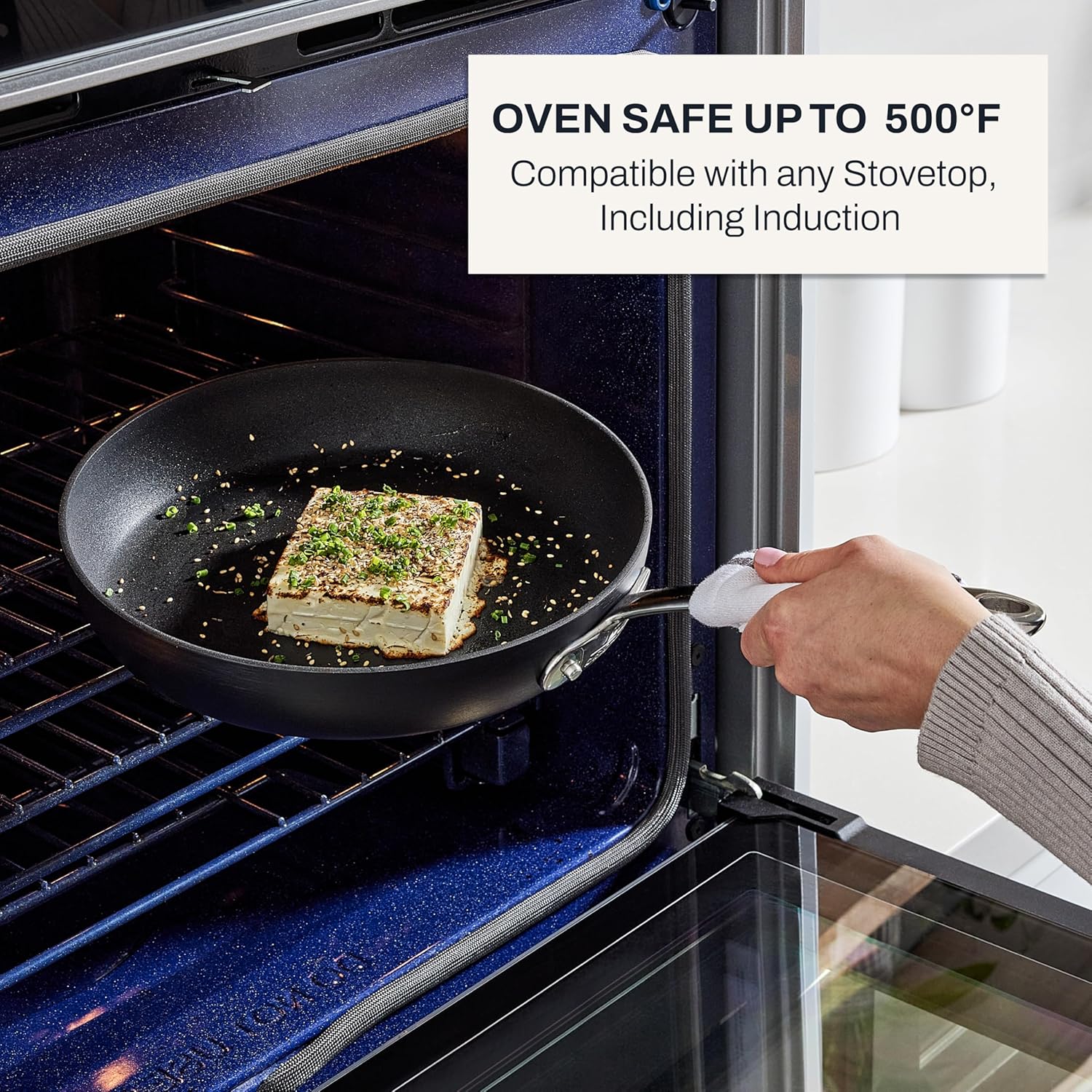 - Oven safe up to 500°F and compatible with any stovetop, including induction. Glass lids are oven safe up to 350°F. Dishwasher safe. To preserve the nonstick, wash your cookware with a soap and sponge, and using silicone, nylon or wooden utensils.