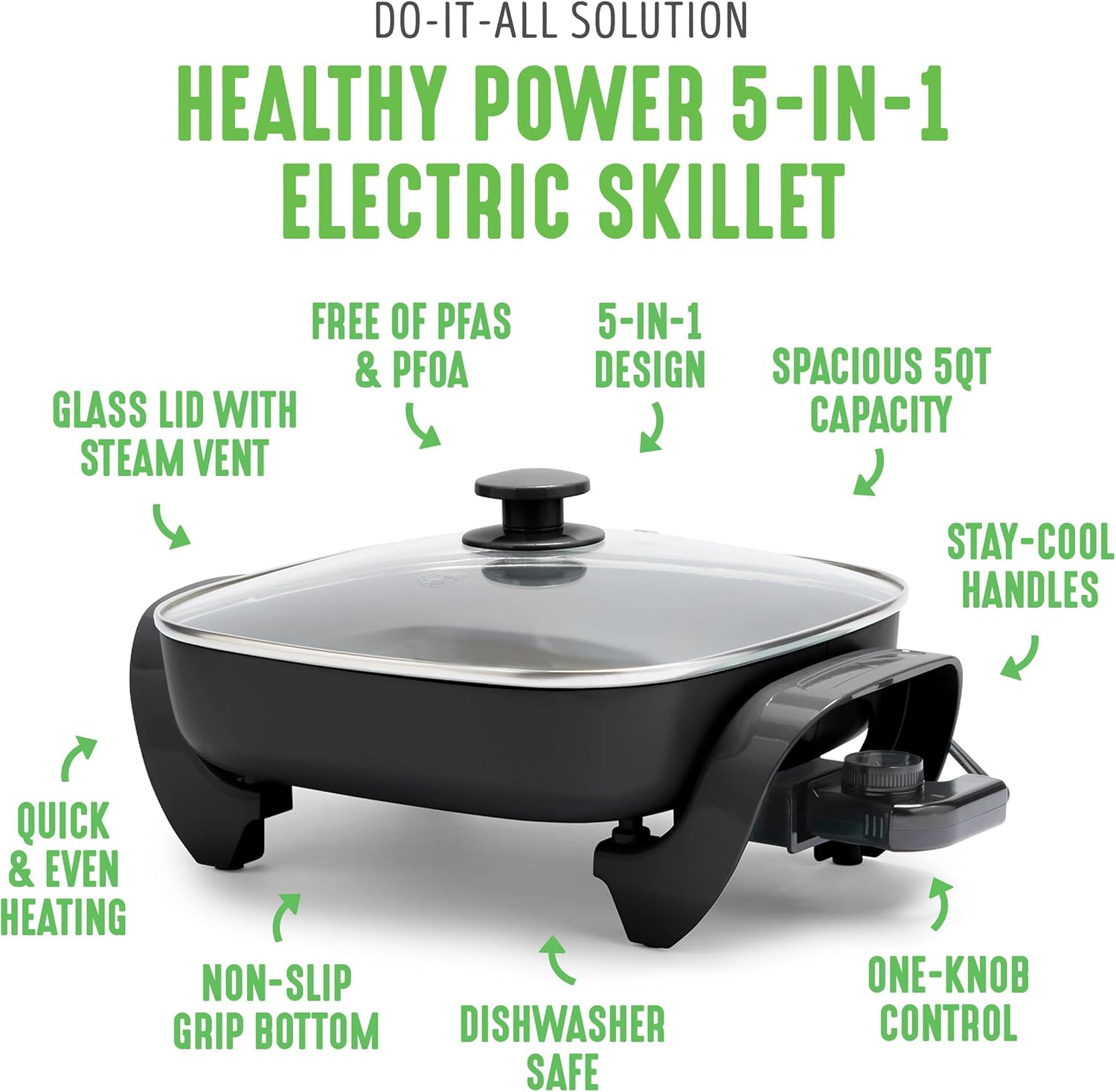 GreenLife 12" 5QT Square Electric Skillet, Glass Vented Lid, Ceramic PFAS-Free Nonstick Coated Interior, Adjustable Temperature Control, Cool Touch Handles, Quick Even Heating, Scratch Resistant,Black