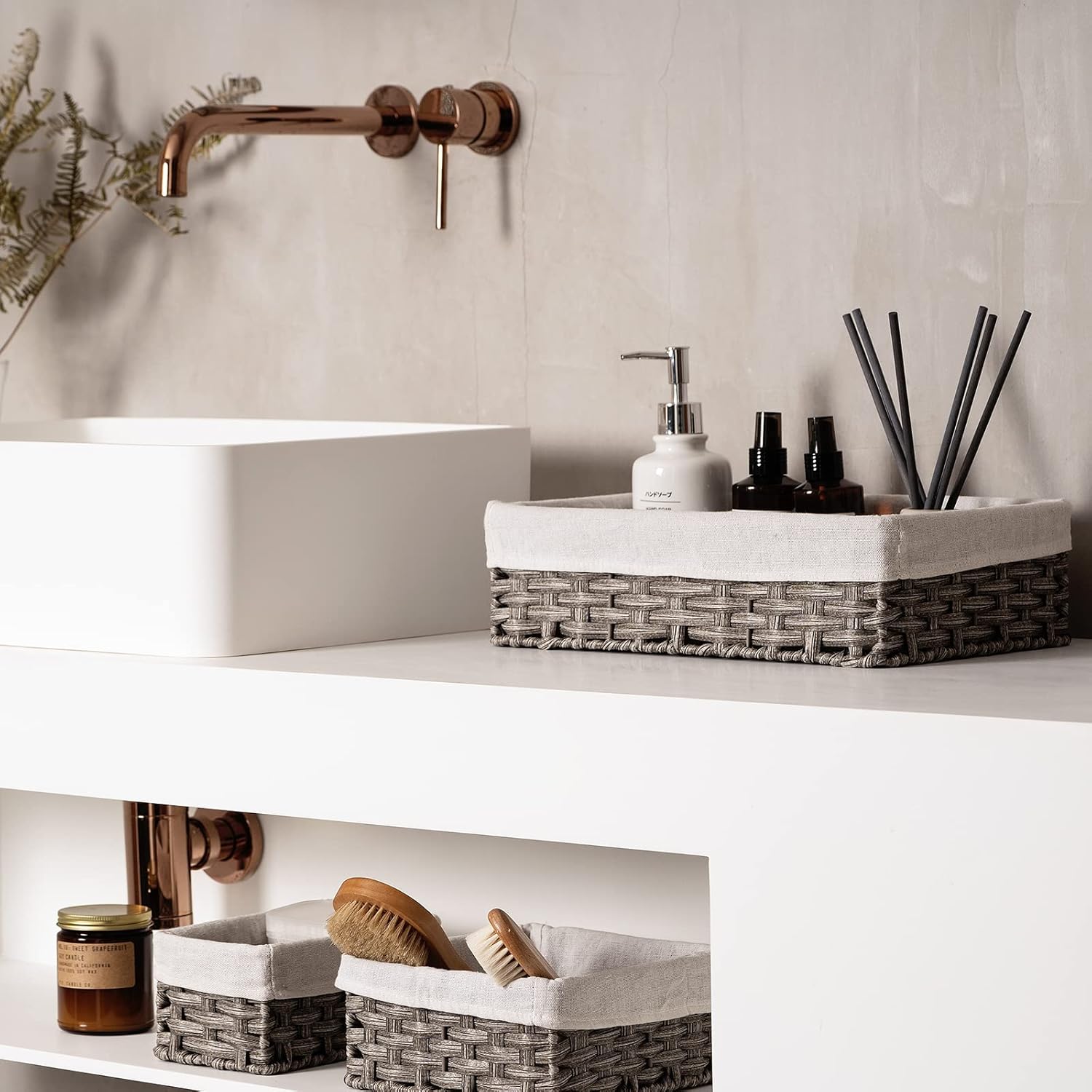 - Waterproof Material & Removable Liner: Small wicker basket made of durable plastic, which is water-resistant, durable and easier to clean. Wicker baskets for organizing featured with Liner, which is removable and washable, convenient for daily use. (Please note: the liners are packed inside, please take out the 2 smaller baskets and put liners into suitable wicker baskets.)