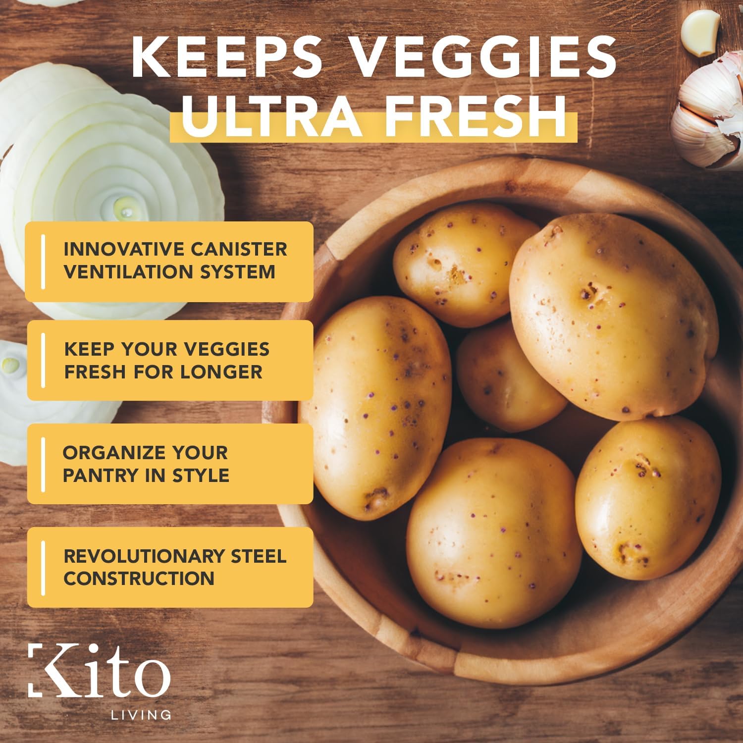 - DURABLE AND STURDY BUILD: The garlic, onion, and potato storage bins are made using lightweight yet durable steel with a protective coating to handle everyday use and come with wooden bamboo lids to keep anything inside safe. The wooden handles allow you to move them around with ease
