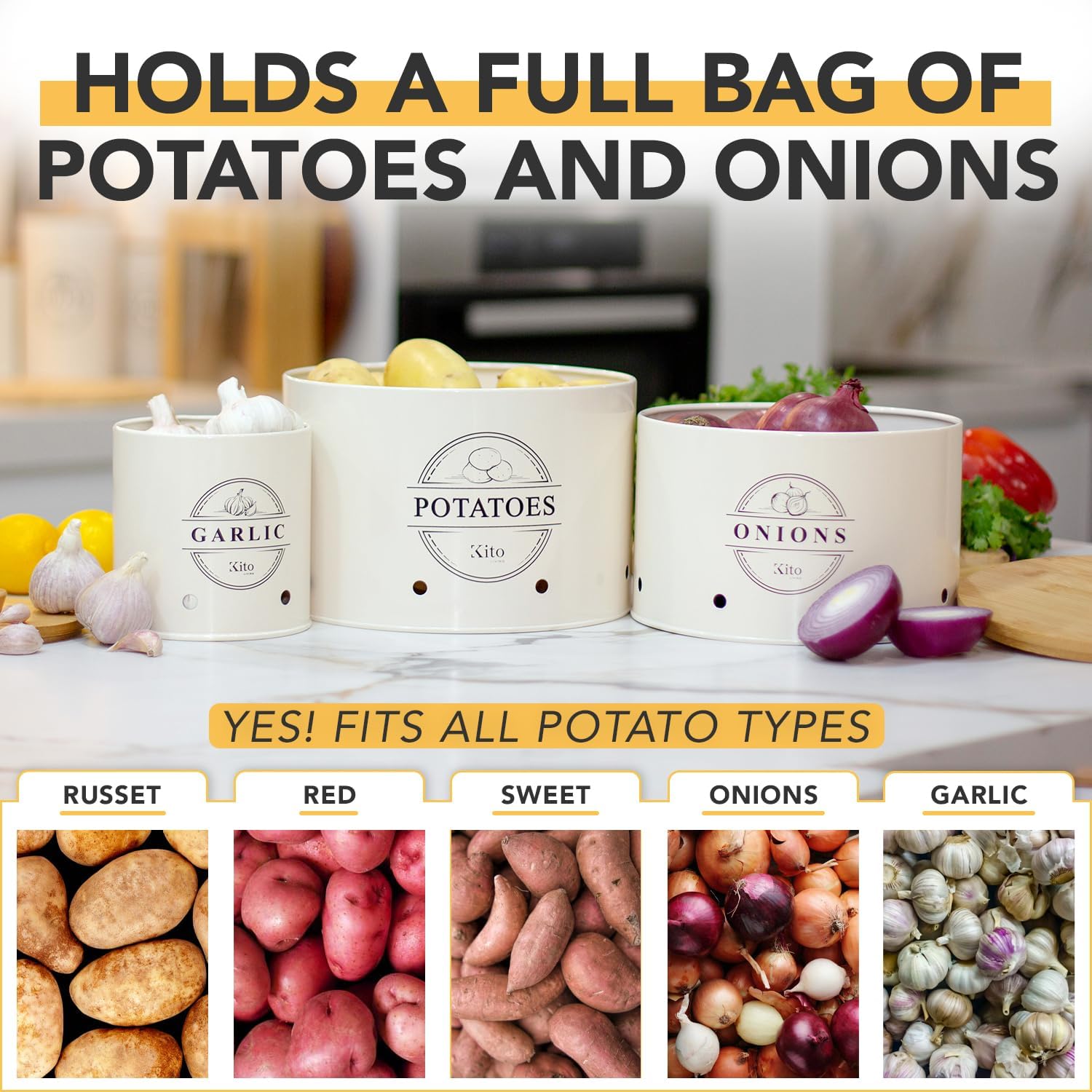 - SPACIOUS AND STACKABLE: Our pantry storage containers offer more space and use a unique stacking design to help you store more while taking up less space on your counters. Each pack comes with a potato canister (10 x 7.1 inch / approx. 8 to 9 lbs), onion canister (9 x 6.2 inch / approx. 5 to 6 lbs), and garlic canister (5.2 x 5.9 inch / approx. 1.5 to 2 lbs)