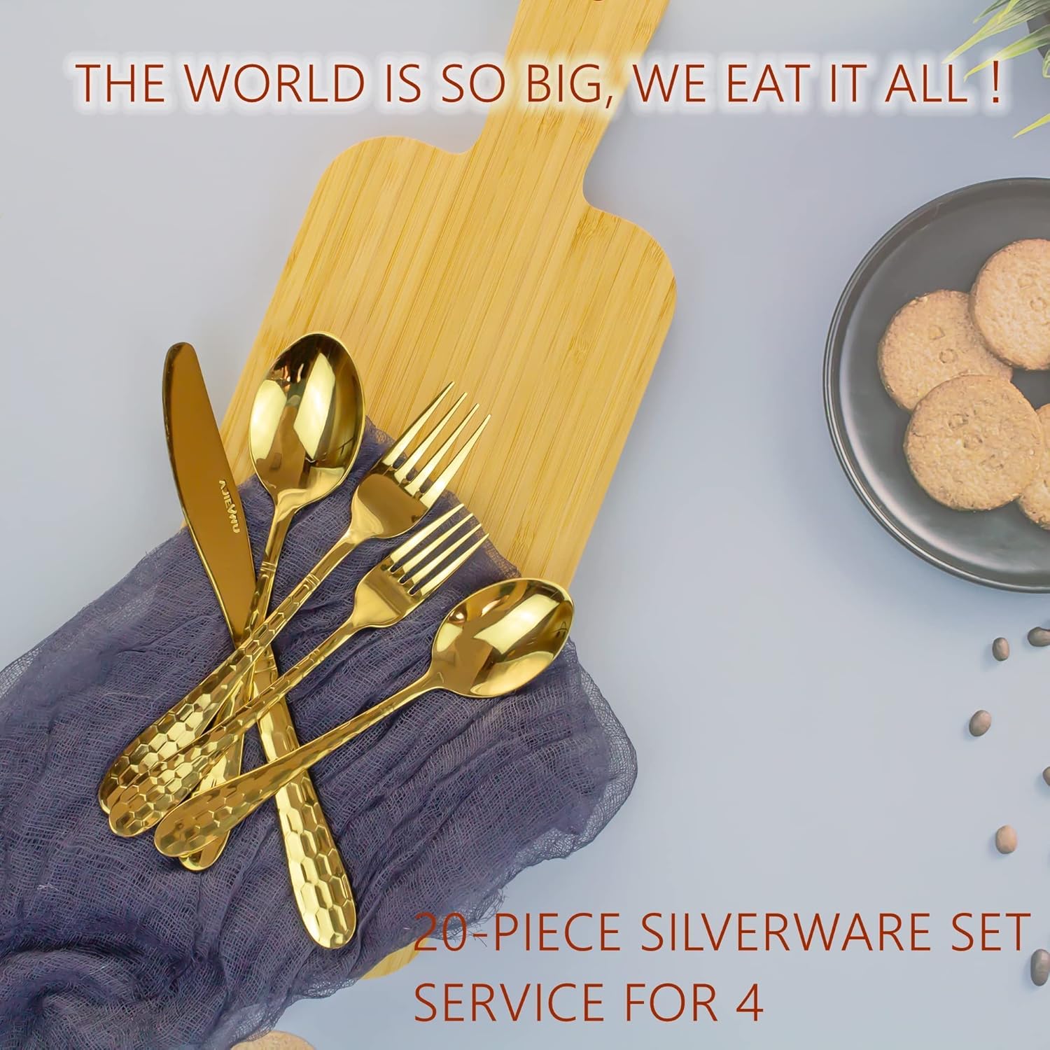 20 Piece Silverware Set for 4, Hammered Silverware Set 18/10 Stainless Steel Tableware Cutlery Flatware Spoons and Forks Set for Home Kitchen Restaurant, Unique Utensils Set Dishwasher Safe (Gold)