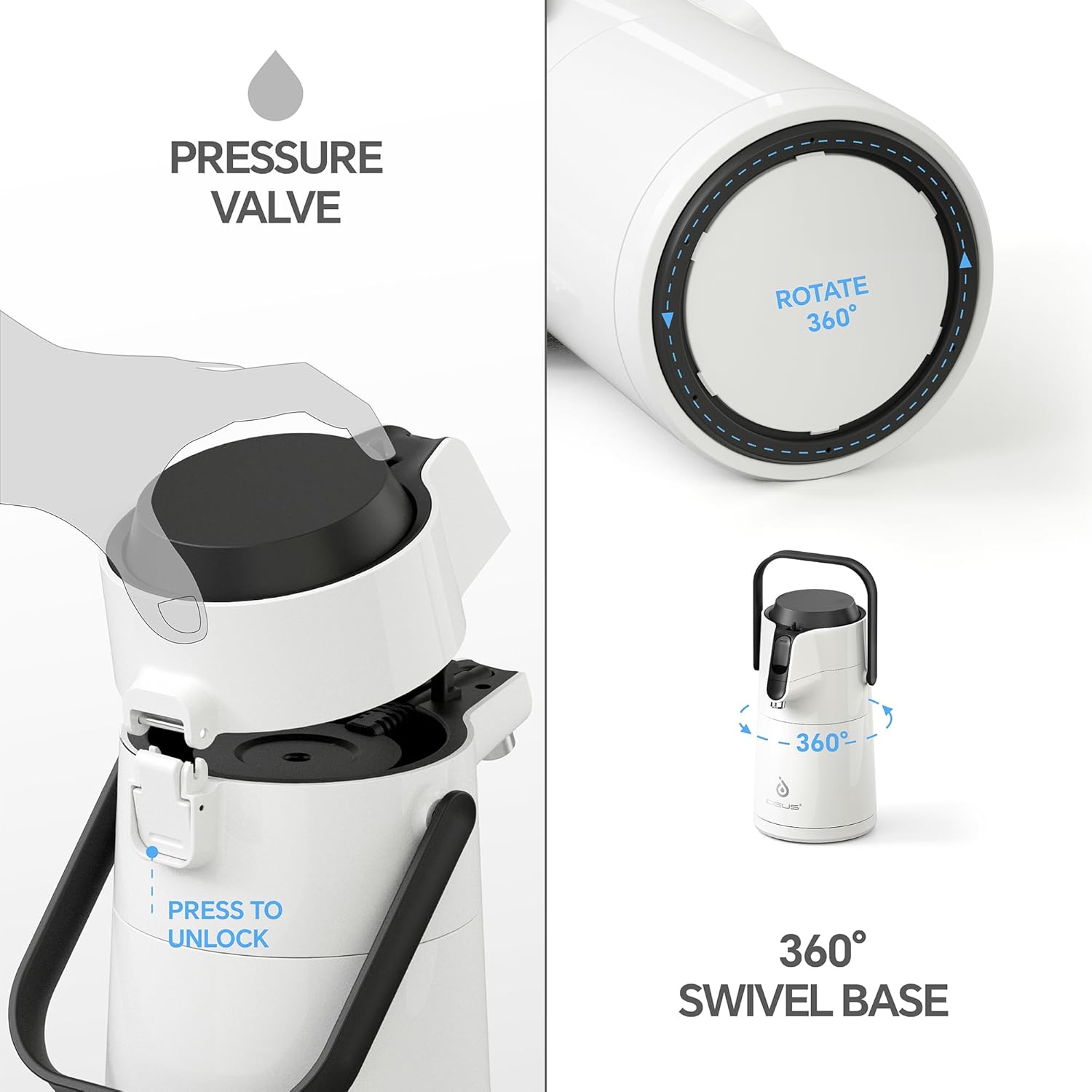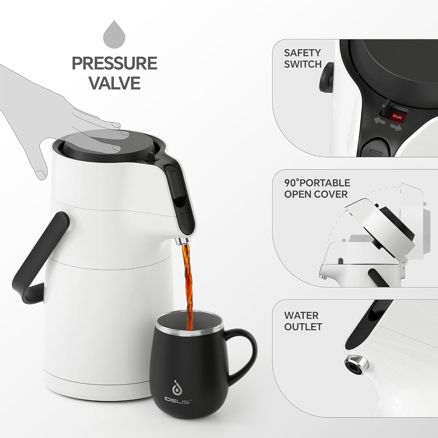 IDEUS Thermal Coffee Carafe 74oz (2,200ml), Stainless Steel Double Wall Insulated Vacuum Flask, Water Jug Coffee Server and Beverage Dispenser, Heat and Cold Retention (White, 74oz (2,200ml))