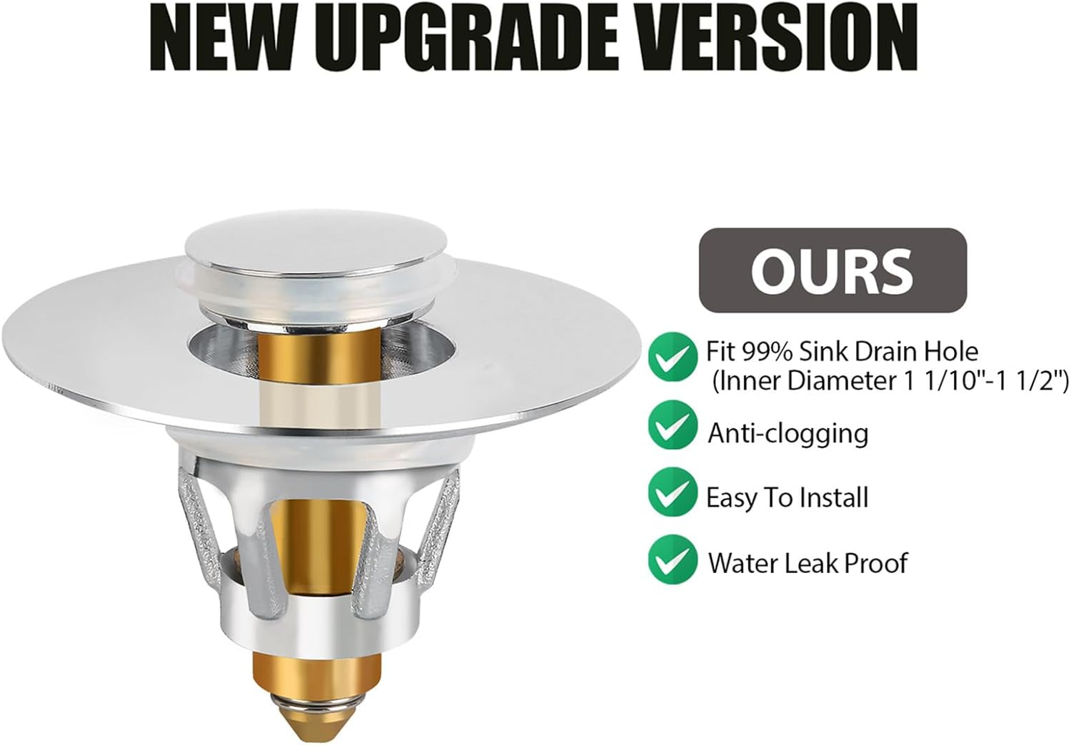 - 2 In 1 Design: The bathroom sink drain strainer has built-in spring that switches freely between pop-up and sealed states with touch. Best of all, it has an anti-clogging basket filter inside that prevents clogged drains such as hair, bracelets
