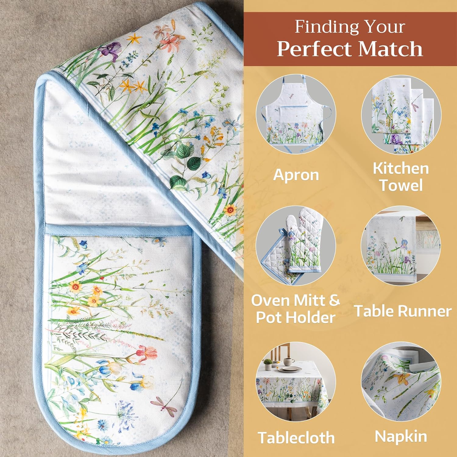 Maison d' Hermine Double Oven Mitts 100% Cotton 7"x35" Double Oven Mitt Heat Resistant BBQ Cooking Gloves with Loop, Baking, Grilling, Home, Kitchen, Handling Hot Pans Spring Summer (Fleurs De Mai)