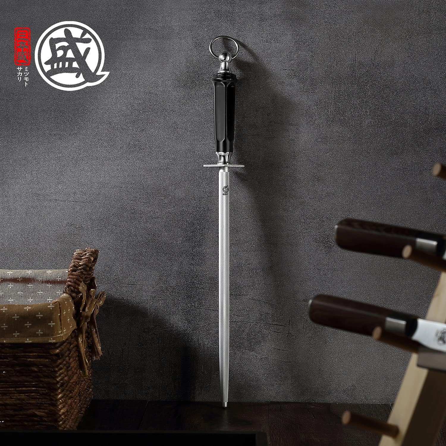 MITSUMOTO SAKARI 10 inch Japanese Honing Steel - Round Diamond Knife Sharpening Rod, Professional High Carbon Sharpener with ABS Handle & Powerful Magnet