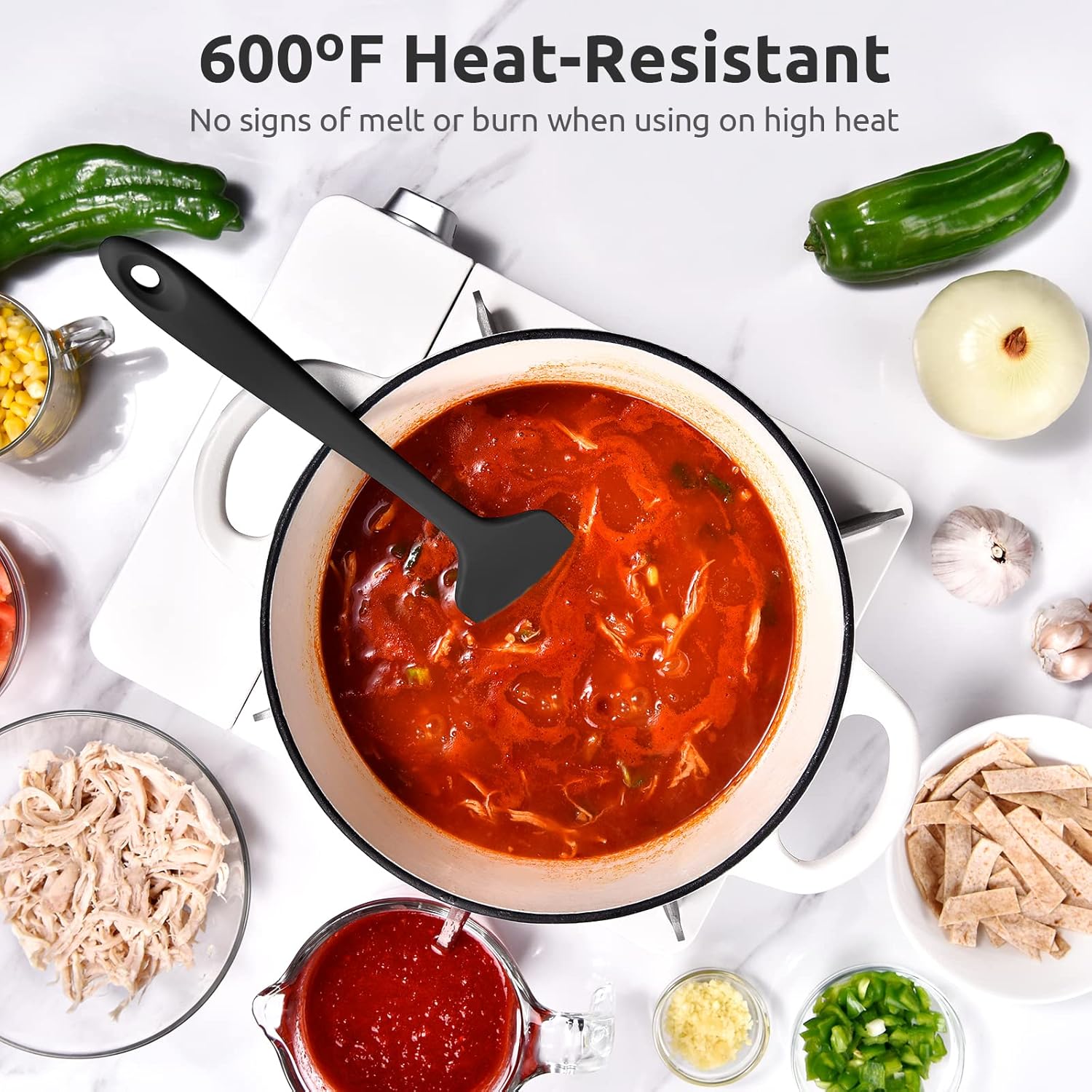 - [600ºF Heat-Resistant for High Heat Cooking] With up to 600 degrees heat resistance, you can use this nonstick silicone spatula in a hot pan without worrying about melted plastic in your dinner. It also works well with high temp sugars, chocolates or sauces. A must for newer cooks who might tend to leave utensils in a nonstick pot while cooking. You can use this heat safe silicone scraper daily for everything from stirring to frying to smoothing.
