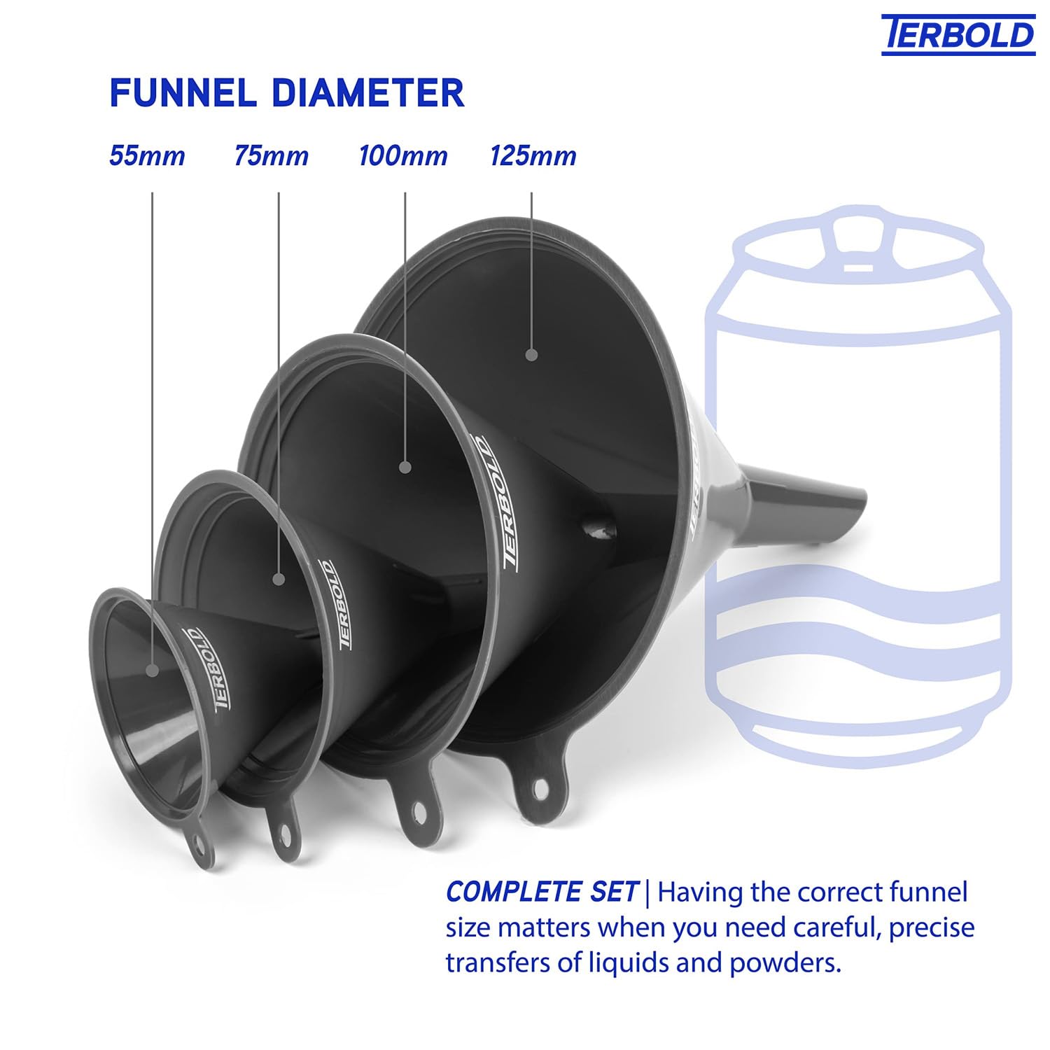 - COMPLETE SET | Having the correct funnel size matters when you need careful, precise transfers of liquids and powders. This set includes 125mm, 100mm, 75mm, and 55mm wide diameters