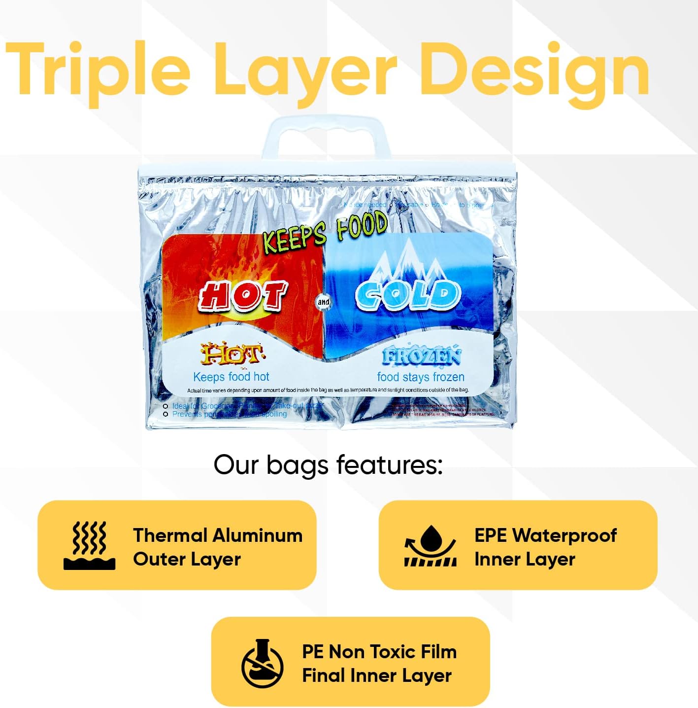 - ✅ TRIPLE LAYER DESIGN - Most other bags are single layer and aren't efficient at maintaining internal temperatures or will start to leak moisture. Our bags feature a sturdy thermal aluminum outer layer, an inner EPE (eco friendly plastic) waterproof layer and a final inner PE non toxic film layer.
