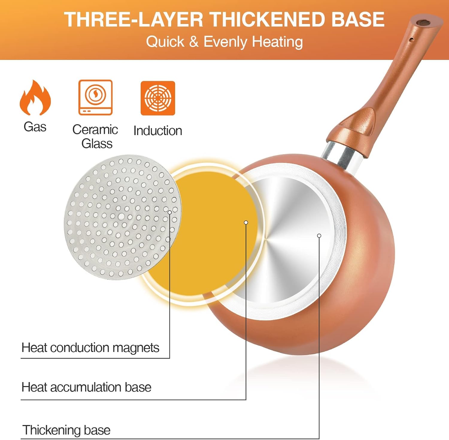 - Ceramic Non-stick Coating - All the copper pots and pans set are Ceramic coating both inside and outside providing superior non-stick performance. 100% free of PTFE/ PFOA/ lead/ cadmium. Non-stick Pans and Pots helps you cook food with less oil, and super easy to clean. - Enjoy healthy and happy life with our kitchenware set!