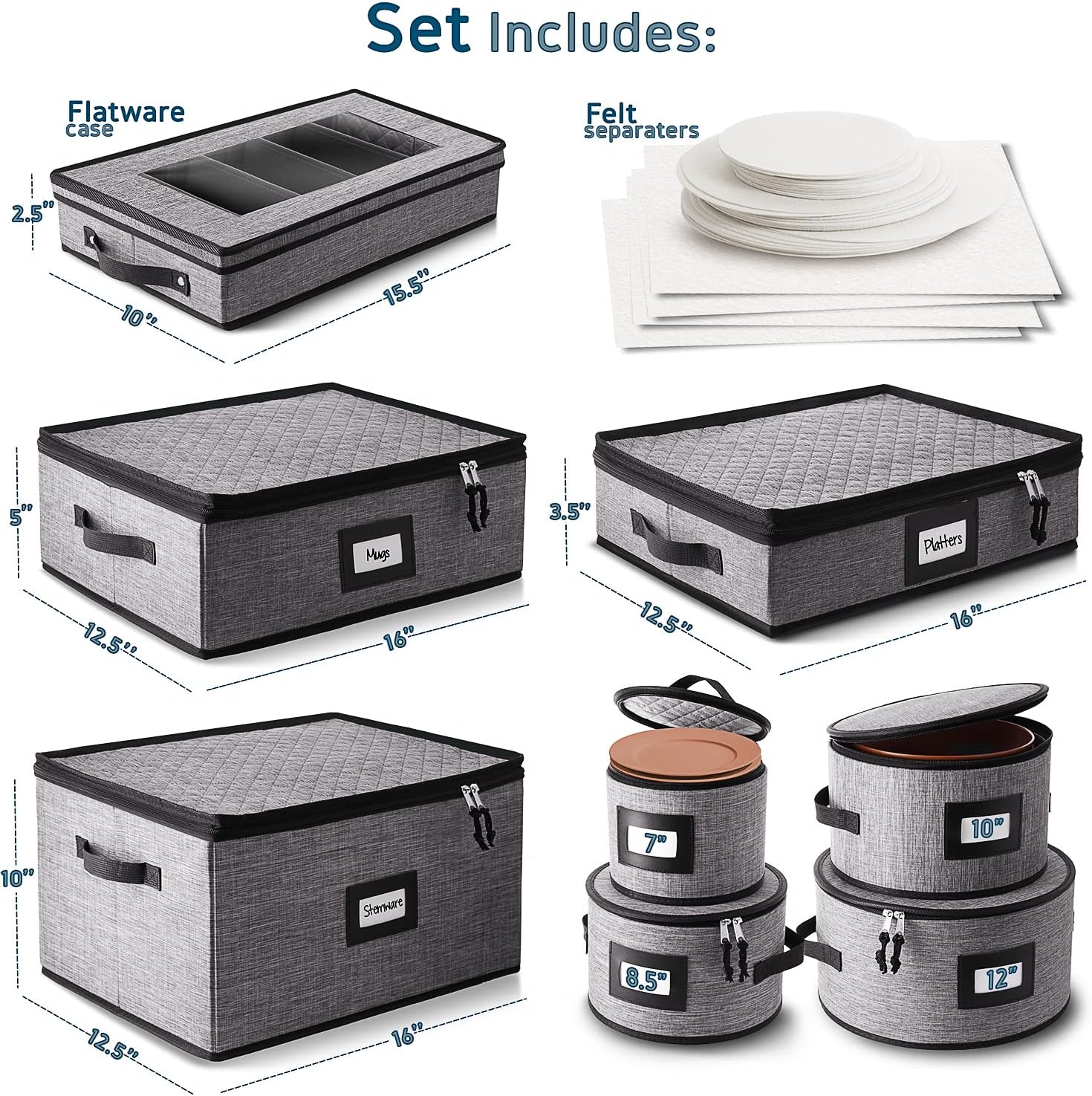 - Dish Organizer Set of 8: This set includes 4 plate storage boxes for 7β, 8.5β, 10β & 12β plates; 1 silverware case 10β x 15.5β x 2.5β; 1 cup storage box 12.5β x 16β x 5β; 1 stemware storage case 12.5β x 16β x 10β; and 1 platter storage case 16β x 12.5β x 3.5β.