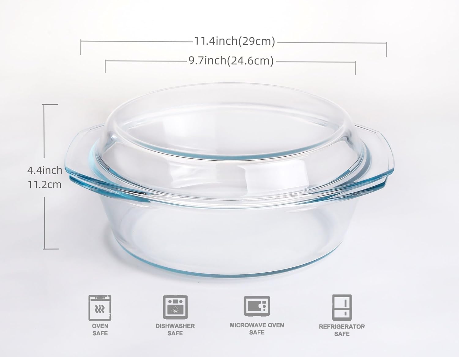 Round Tempered Glass Casserole Dish with Lid, Glass Casserole Baking Dish for Oven, Freezer and Dishwasher Safe - 2.5QT