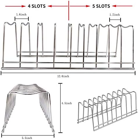 - Pack of 2 pot lids holder.DIMENSIONS: Overall Dimensions -12-4/5"W x 4-1/2"H x 4-1/3"D; Each compartments width: there are 4 Slots x 1.57" width and 5 Slots x 1.18" width to fit your different needs.